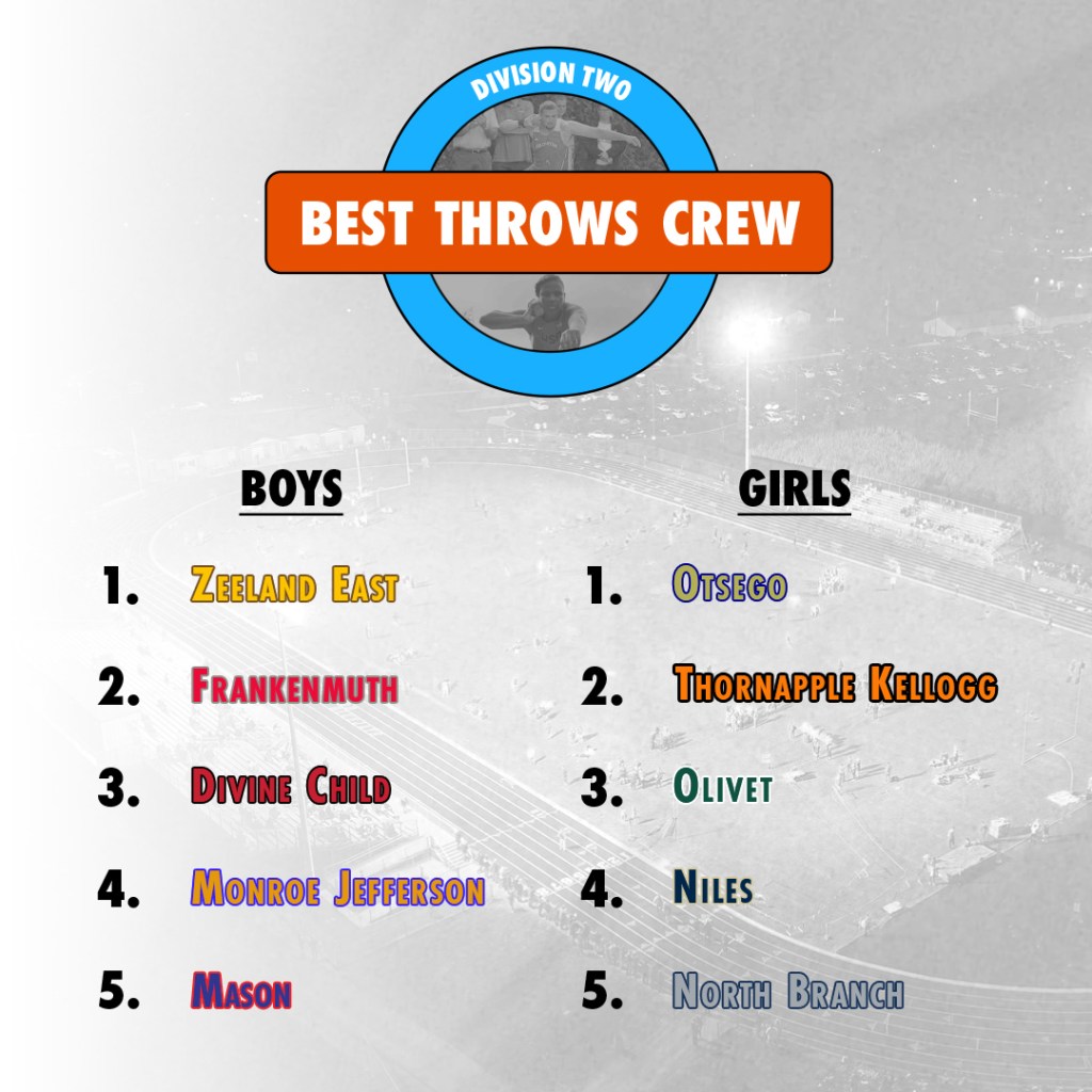 Rank Team Avg. Distance 1 Zeeland East 48′ 3.3″ 2 Battle Creek Lakeview 46′ 4.8″ 3 East Kentwood 45′ 11.7″ 4 Monroe Jefferson 45′ 8.7″ 5 Monroe 45′ 3.7″ 6 Carson City-Crystal 45′ 3.3″ 7 Frankenmuth 45′ 1.7″ 8 Traverse City Central 45′ 1.5″ 9 Swartz Creek 44′ 9.8″ 10 Saginaw Heritage 44′ 5.4″ 11 Cadillac 44′ 5″ 12 Corunna 44′ 0″ 13 Dearborn Divine Child 43′ 8″ 14 Grand Rapids West Catholic 43′ 7.9″ 15 Macomb Dakota 43′ 5.2″ 16 Novi 43′ 0.7″ 17 Bath 42′ 11.7″ 18 St. Joseph 42′ 7.5″ 19 Portland 42′ 7″ 20 Otsego 42′ 6.7″ 21 Zeeland West 42′ 6.2″ 22 White Cloud 42′ 5.1″ 23 Traverse City West 42′ 4.8″ 24 Hopkins 42′ 3.1″ 25 Pewamo-Westphalia 42′ 2.3″