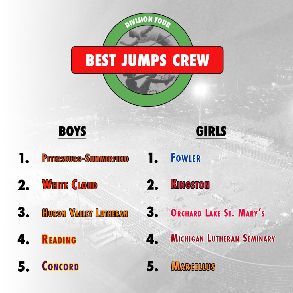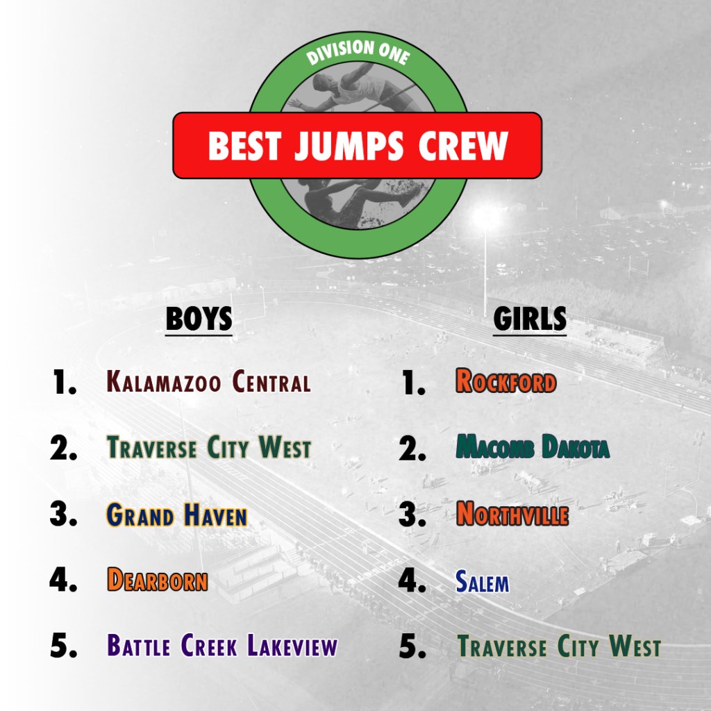 Rank Team Avg. Distance 1 Rockford 16′ 8.8″ 2 Macomb Dakota 16′ 2″ 3 Oak Park 15′ 11.8″ 4 Hudsonville 15′ 11″ 5 Zeeland East 15′ 10.3″ 6 East Kentwood 15′ 9.7″ 7 Onsted 15′ 8.6″ 8 St. Joseph 15′ 7.5″ 9 Holland West Ottawa 15′ 6.5″ 10 Traverse City West 15′ 6.3″ 11 Otsego 15′ 6.2″ 12 Plymouth 15′ 5.3″ 13 Northville 15′ 5″ 14 Livonia Churchill 15′ 4.8″ 15 Pinckney 15′ 4.7″ 16 Mason 15′ 4.3″ 17 Howell 15′ 3.8″ 18 Ann Arbor Huron 15′ 3.7″ 19 Saline 15′ 3.4″ 20 Hudsonville Unity Christian 15′ 3″ 21 Clarkston 15′ 2.9″ 22 Fenton 15′ 1.9″ 23 Midland Dow 15′ 1.9″ 24 Gladwin 15′ 1.8″ 25 Holt 15′ 0″