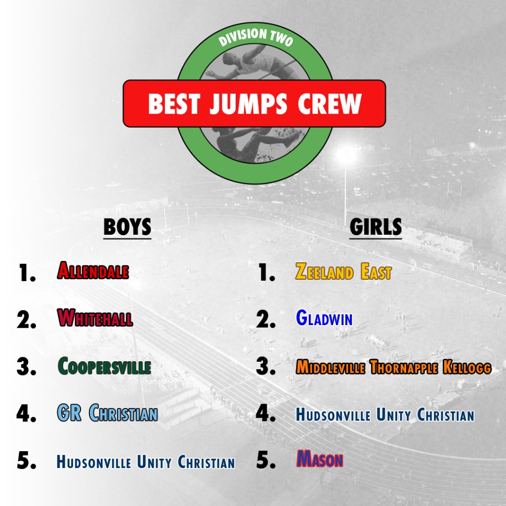 Rank Team Avg. Distance 1 Holt 20′ 10.17″ 2 Holland West Ottawa 20′ 4.17″ 3 Hudsonville 20′ 3.92″ 4 East Kentwood 20′ 3.5″ 5 Wayland Union 20′ 3.25″ 6 Allendale 20′ 2.67″ 7 Kalamazoo Central 20′ 2.17″ 8 Cedar Springs 20′ 0.75″ 9 Grand Haven 20′ 0″ 10 Saline 20′ 0″ 11 Grand Rapids Christian 19′ 11.5″ 12 Traverse City West 19′ 11.33″ 13 Midland Dow 19′ 11.17″ 14 Woodhaven-Brownstown 19′ 10.17″ 15 Corunna 19′ 10.17″ 16 Lake Orion 19′ 9.92″ 17 Battle Creek Lakeview 19′ 9.92″ 18 Temperance Bedford 19′ 8.92″ 19 Hudsonville Unity Christian 19′ 8.83″ 20 Whitehall 19′ 8.33″ 21 Livonia Franklin 19′ 8″ 22 Lansing Waverly 19′ 7.67″ 23 Holland 19′ 6.08″ 24 Fowlerville 19′ 5.58″ 25 Hillsdale 19′ 5.42″