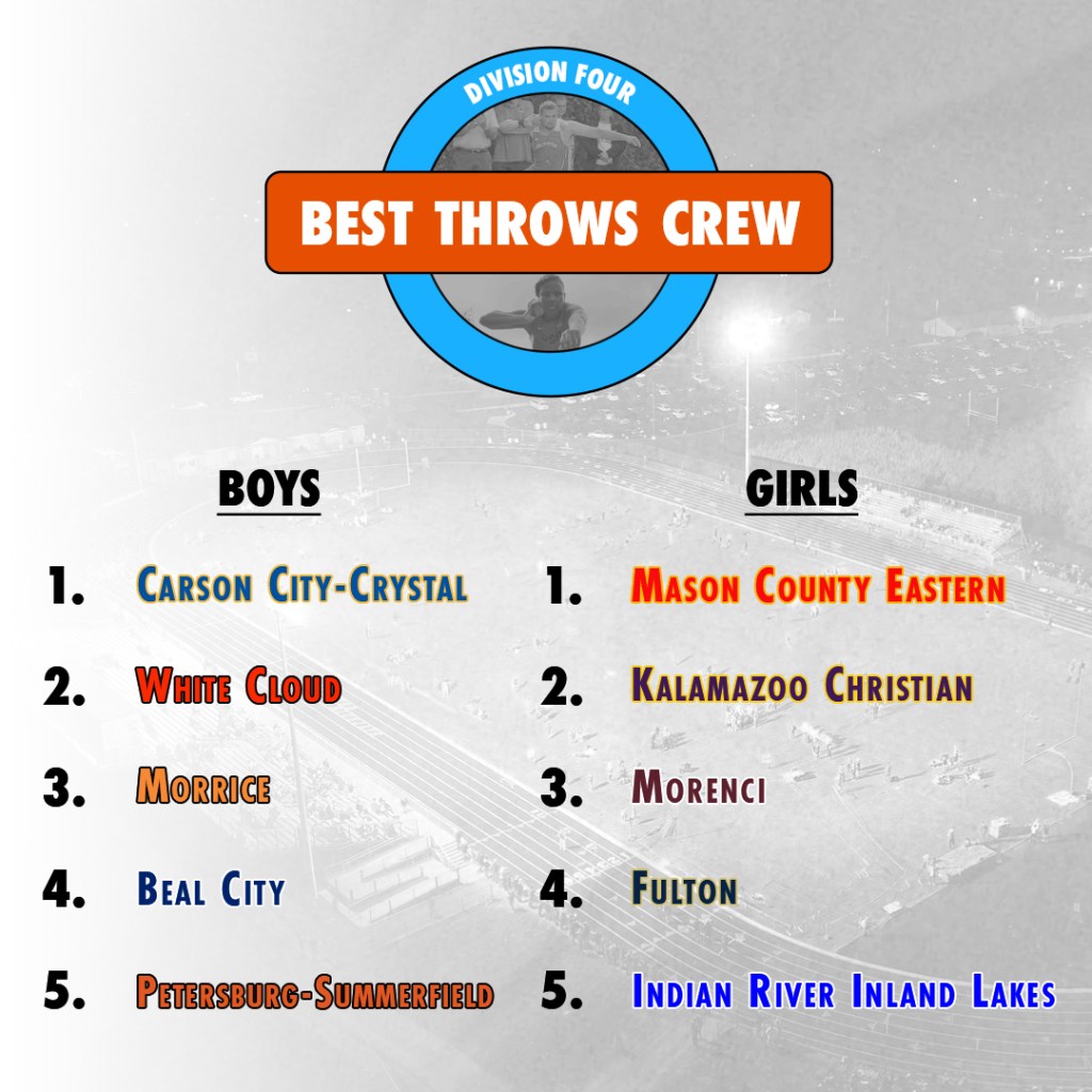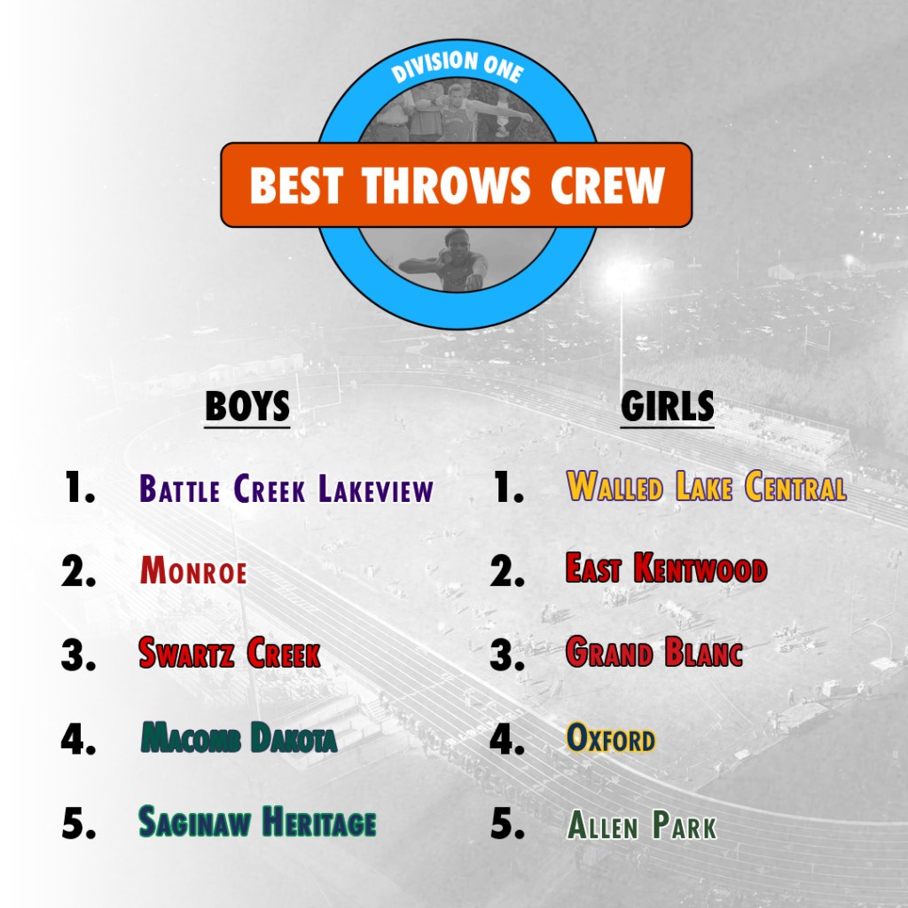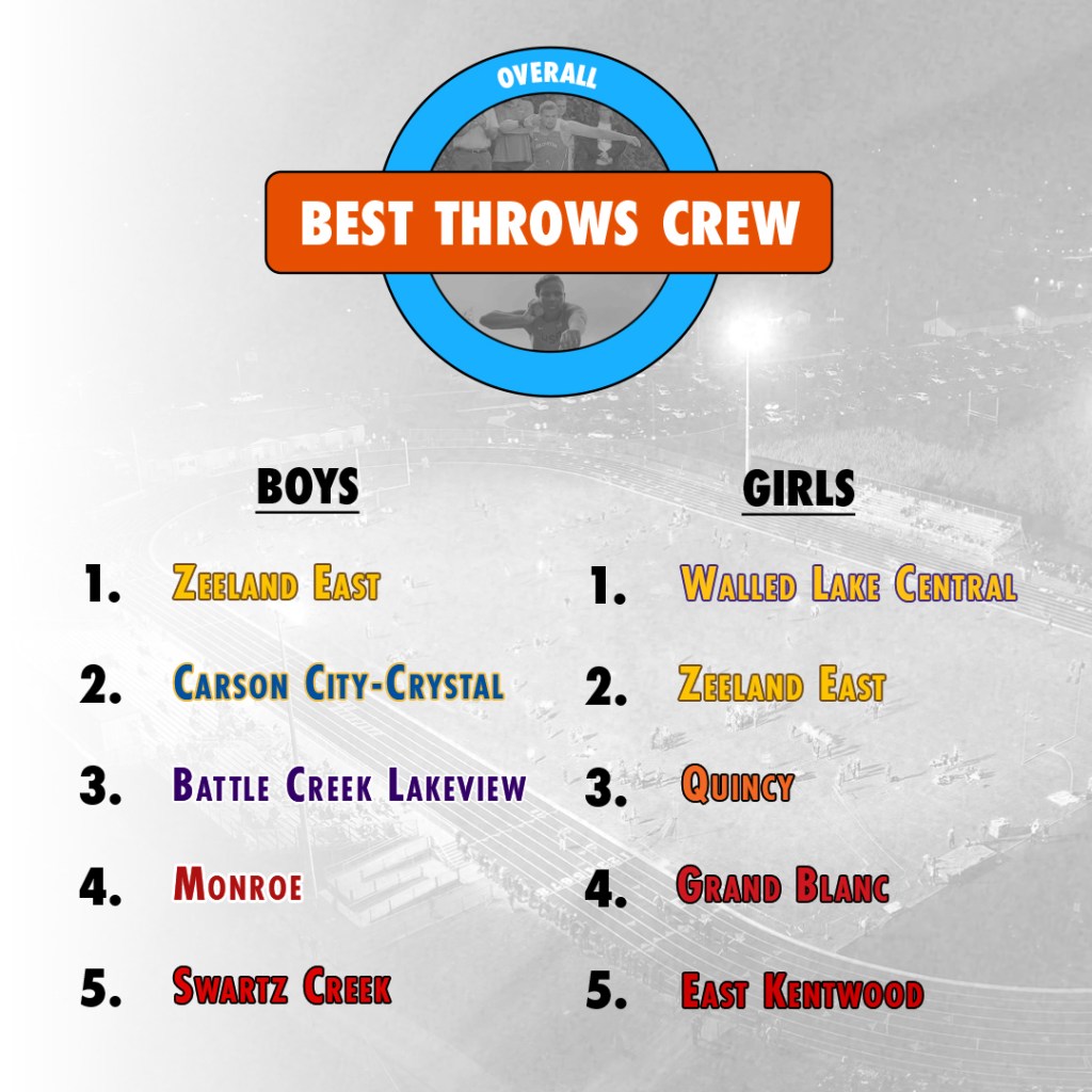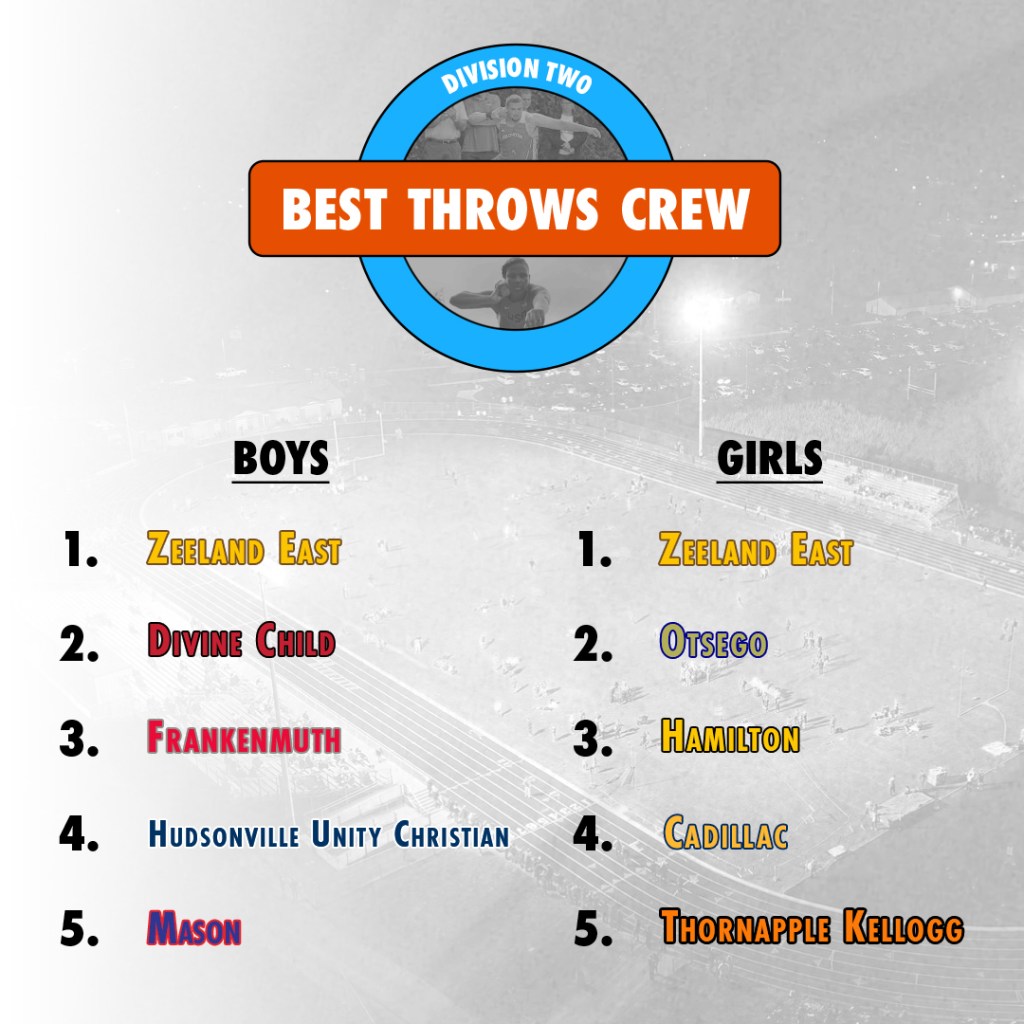Rank Team Avg. Distance 1 Zeeland East 50′ 8.92″ 2 Carson City-Crystal 49′ 8.25″ 3 Battle Creek Lakeview 47′ 2.92″ 4 Monroe Jefferson 47′ 2.83″ 5 Macomb Dakota 47′ 1.08″ 6 Frankenmuth 46′ 10.33″ 7 Traverse City Central 46′ 7.42″ 8 Pewamo-Westphalia 46′ 0.33″ 9 Swartz Creek 46′ 0.33″ 10 Monroe 45′ 9.5″ 11 Saginaw Heritage 45′ 8.33″ 12 East Kentwood 45′ 6.92″ 13 Dearborn Divine Child 45′ 2.5″ 14 Hudsonville 45′ 0″ 15 Mason 45′ 0″ 16 Cadillac 44′ 11.75″ 17 St. Joseph 44′ 10.83″ 18 Zeeland West 44′ 7″ 19 White Cloud 44′ 3.75″ 20 Bath 44′ 3.5″ 21 Corunna 44′ 1.67″ 22 Grand Rapids West Catholic 44′ 0.42″ 23 Hudsonville Unity Christian 43′ 11″ 24 Traverse City West 43′ 10.75″ 25 Novi 43′ 10.08″
