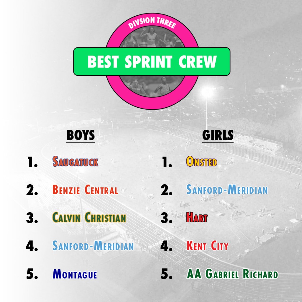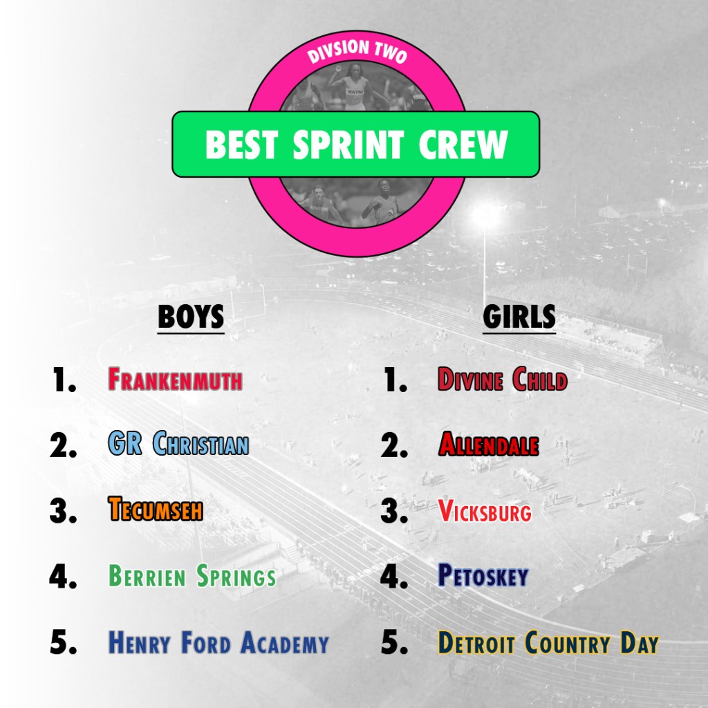 Rank Team 100m 200m 400m Total 1 Frankenmuth 3 3 8 14 2 Grand Rapids Christian 1 7 22 30 3 Tecumseh 11 1 21 33 4 Berrien Springs 6 2 26 34 5 Dearborn Henry Ford Academy 8 14 16 38 6 Flint Powers Catholic 25 5 10 40 7 Corunna 2 26 14 42 8 Allendale 16 10 18 44 9 Whitehall 27 18 11 56 10 Wayland Union 7 6 47 60 11 Forest Hills Eastern 12 16 33 61 12 Ionia 33 21 9 63 13 Hudsonville Unity Christian 46 11 6 63 14 Gladwin 15 40 15 70 15 Lansing Sexton 50 22 12 84 16 Chelsea 39 15 30 84 17 Freeland 17 17 51 85 18 Riverview 51 33 4 88 19 Kingsford 10 19 59 88 20 Milan 29 20 44 93 21 New Boston Huron 49 12 34 95 22 Spring Lake 58 37 2 97 23 Sparta 31 50 17 98 24 Battle Creek Harper Creek 24 62 13 99 25 Saginaw 5 4 90 99