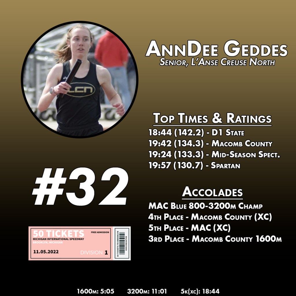 In both the 1600m and 3200m, she was able to thrown down times and rack up awards, 5:05 was good enough for 20th in D1, 11:01 the 18th fastest time among all returners, and she grabbed a Macomb County title along the way