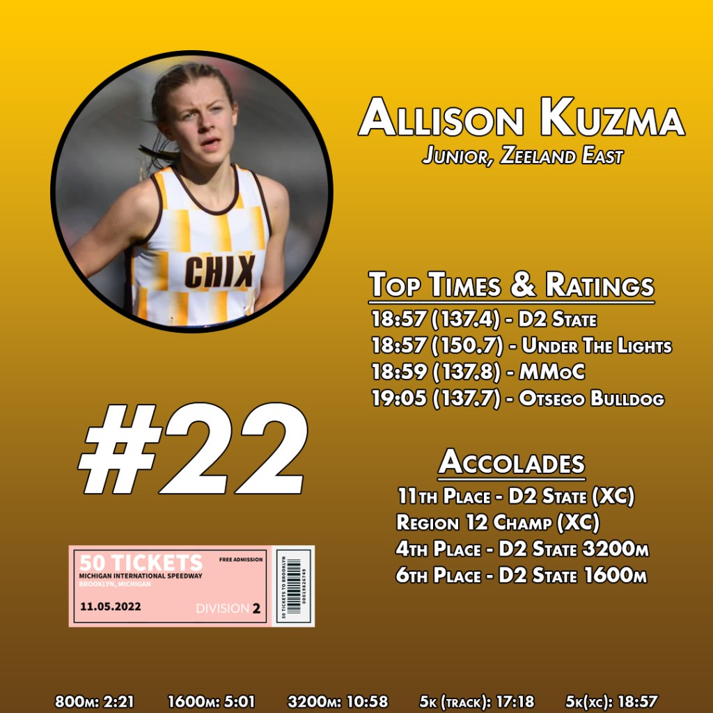 | 10 | Allison Kuzma | 19:05.8 | 137.7 | Otsego Bulldog | Otsego HS | 2-Oct |