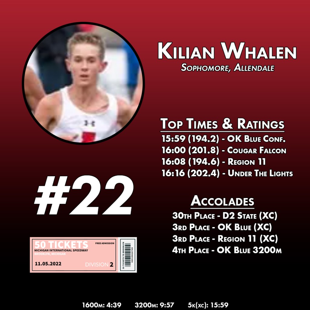 | 9 | Kilian Whalen | 15:59.5 | 194.2 | OK Blue Conference | Holland Christian HS | 20-Oct |