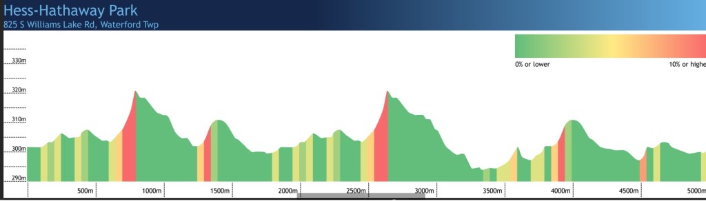 Home of the “Beautiful Lady”, a massive hill ran twice en route to regional glory. But don’t discount the other rollers – and leave a bit for that last stretch. Based on the tight packs for qualifying spots and team trophies, there will be races won or lost down the stretch. Last year’s OAA Blue course ran curiously fast, the remainder of the meets held here were a solid -30 or so. My guess is this runs a little slower than other regionals, a perfect test for the mix of Macomb and Oakland County teams. Course map and elevation chart:
