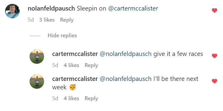 | 12 | Connor Ackley | 14:57.0 | Hilliard Davidson | 226.0 |