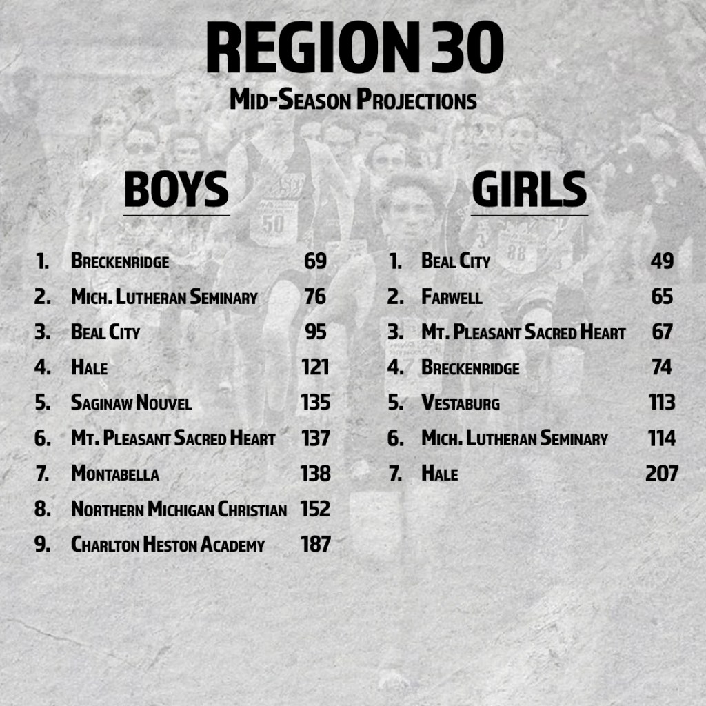 As projected over the summer, there will be four teams fighting for three spots. Breckenridge made history last week, winning their first ever MSAC Jamboree over the Sacred Heart team ranked above them. Both outfits from Mt. Pleasant Sacred Heart have battled numbers issues, what was four girls competing at Michigan Catholic has turned into six finishers at Cadillac. Beal City has added depth, and I’ve heard the Aggies may have another surprise up their sleeve.
