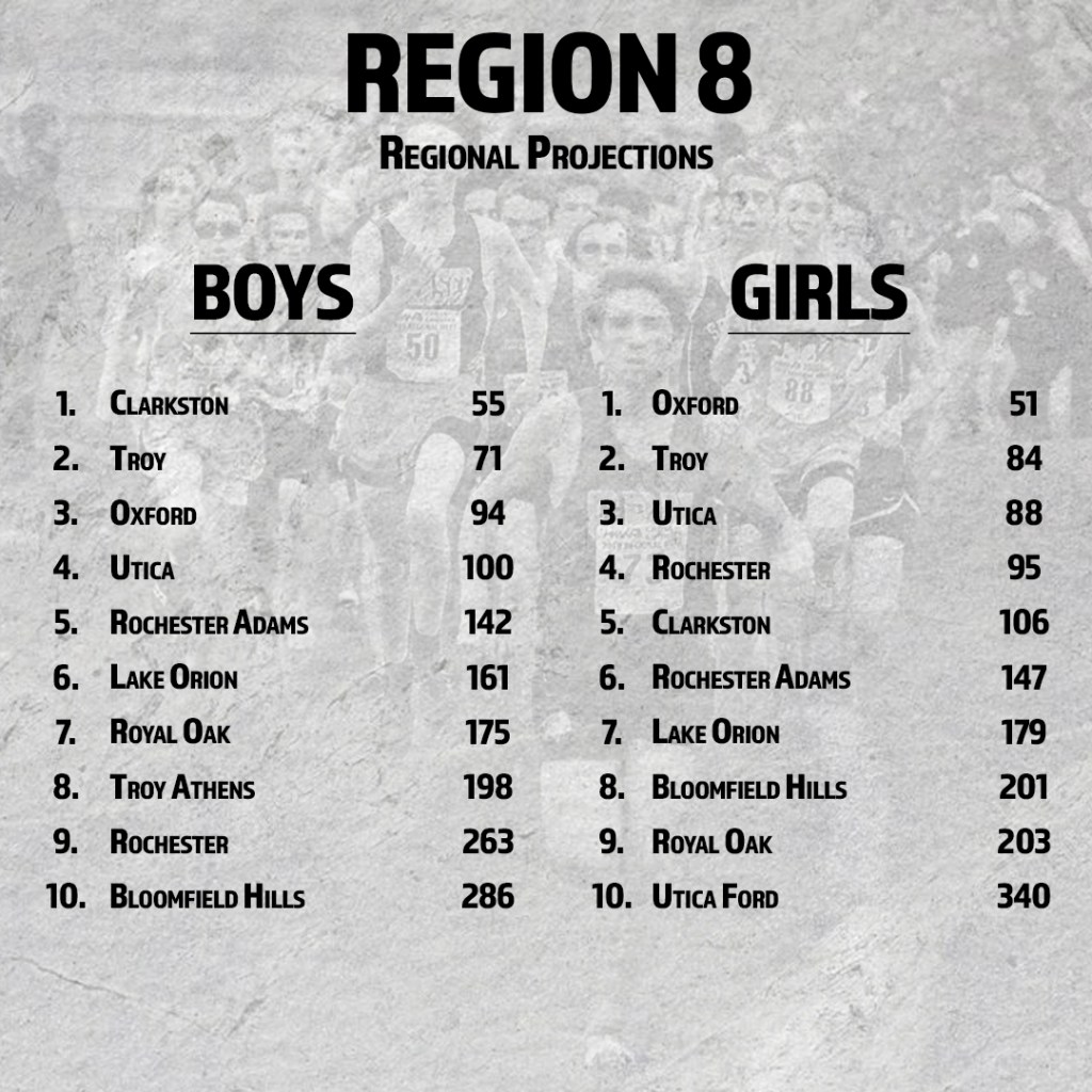 These are a bit different than they’ve been in the past. I’m trying to project as always, but changing it up a bit in terms of the methodology. In the past, I’ve just sorted out by the ratings, then scored as if they’re a cross country meet. Here, I’m doing the same thing, but running simulations. Essentially, given a runner’s ratings and the variance in their ratings throughout the season, I’m able to generate a large sample of “races” and not just one scenario. The thought is that this will give a better depiction of what may occur. If an athlete is consistent, that will be represented. If an athlete is polarizing, but has a chance at greatness, that will be represented. Both aren’t possible when just throwing out one race. The Macomb County projections were done in the same manner and TullyRunners explains it here.