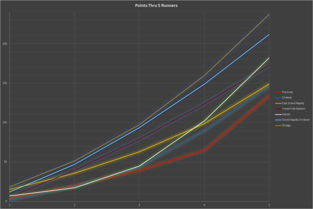 The three bring forth different styles and compositions to their scoring. Pinckney is stronger up front, their 5th rapidly improving. In comparison, East Grand Rapids is a bit behind Pinckney with regard to their top guys, but has a consistently stronger 5th. Chelsea is a blend between the two, again with great depth and the ability to displace.