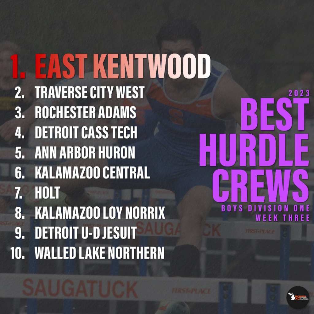 Here’s an example of one of the better early season crews, the Traverse City West high hurdlers, with their varied mix of seniors and freshmen: