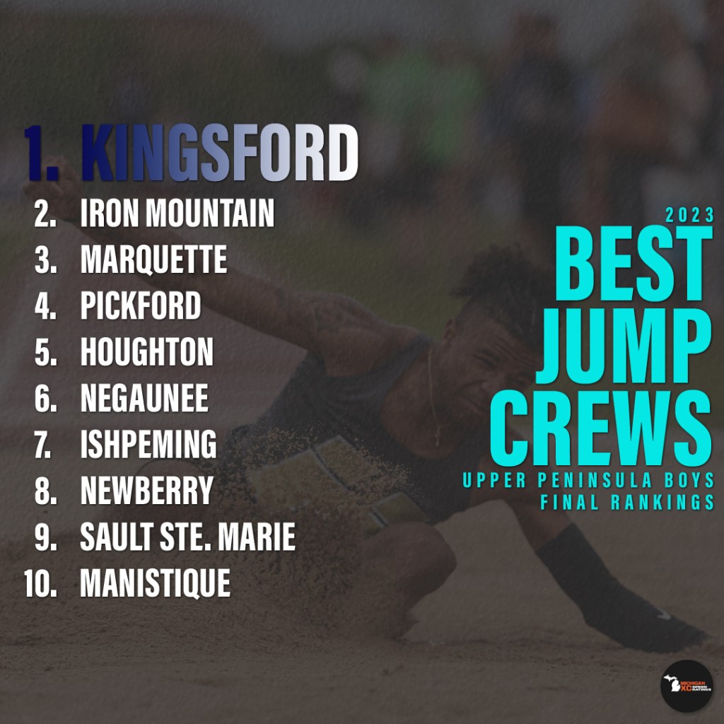 UP Rank Team High Jump Long Jump Total 1 Kingsford 1019 1263 2282 2 Iron Mountain 613 1155 1768 3 Marquette 670 943 1613 4 Pickford 1103 373 1476 5 Houghton 613 857 1471 6 Negaunee 349 917 1266 7 Ishpeming 642 601 1242 8 Newberry 670 331 1001 9 Sault Ste. Marie 642 325 967 10 Manistique 934 0 934 11 Gladstone 321 586 907 12 Forest Park 585 264 849 13 Calumet 391 336 727 14 Menominee 377 299 676 15 Rapid River 321 341 662 16 Munising 293 338 630 17 Powers North Central 349 272 621 18 Lake Linden-Hubbell 335 284 619 19 Bark River-Harris 0 608 608 20 St. Ignace 321 265 586 21 Bessemer 0 579 579 22 North Dickinson County 293 275 568 23 Wakefield-Marenisco/Bessemer 349 0 349 24 Stephenson 0 334 334 25 Baraga 321 0 321