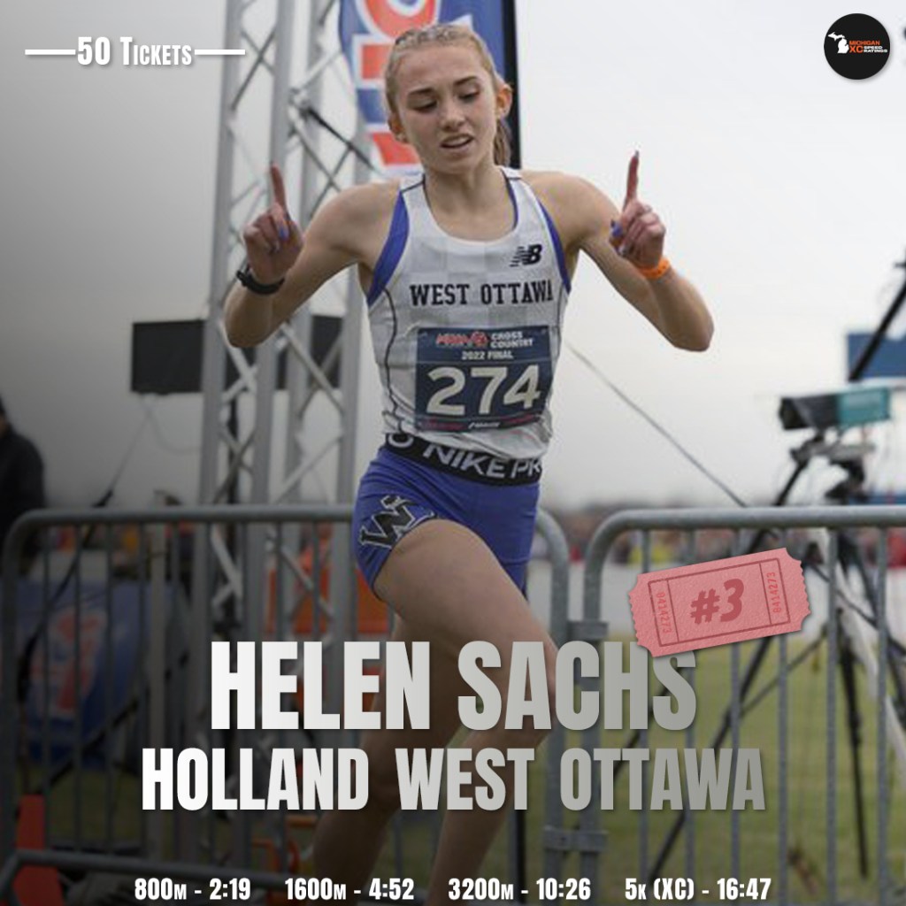 The 2022 fall season was without a doubt, her time to set the pace. After her opener at Under the Lights (a PB at the time, Helen, mind you), she reeled off a season full of victories. Aggressively setting the pace from the gun, she took home wins at huge invites such as Otsego Bulldog, Spartan and Portage, running in the low-17’s and priming herself for championship season. That championship season went about as spectacularly as the regular season, with victories in the OK Red, Region 1, NXR Midwest, and Division 1 State. Unfortunately, her postseason was cut short by injury (but she still made it to Oregon and San Diego!) and then track the same, but I trust that the West Ottawa coaches will have Helen ready to defend her individual and their team title.