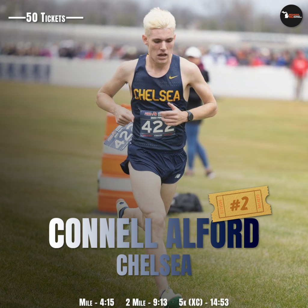 Connell seized every bit of that opportunity. After two wins in the Saline Early Bird and the first SEC White Jamboree, he raced with the big boys at Spartan, hanging with all the way to 3rd place finish, a 15:06 and Chelsea school record. The D2 mid-season is packed with teams racing against each other, two prominent examples being Otsego Bulldog and Portage, and each were substantial victories, 100+ meters the gap. Post-Spartan, he picked up win after win, an undefeated and unchallenged streak growing in numbers. At State, it was more of the same, leading the field through a pedestrian first mile (5:03), before laying down the hammer, closing his last 2.1 in 4:50 pace.