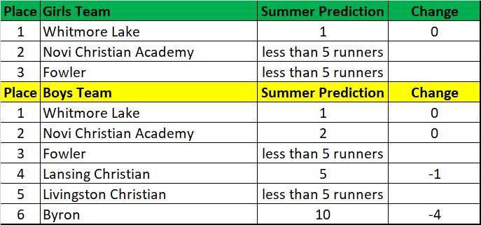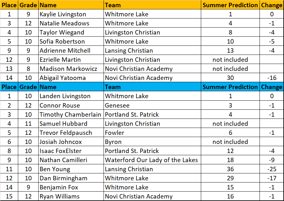 These might be much different than the athletic.net hypothetical meet. Anet uses the best performance from the season. I take more races into account, as I feel the entire resume speaks a greater volume about someone. Anet uses jamborees and duals, for which I don’t have time to calculate. Anet doesn’t account for course differences. If you take the 160 boys that ran at both Holly and Jackson, on average the Jackson times were 30 seconds faster. We have great coaches in this state that promote week-to-week improvement, but clearly there are differences in courses (and there are short/questionable ones too)! I’m not saying one is better than the other, just that I prefer my own and my bet is that they’ll be more accurate when we do this again next month.