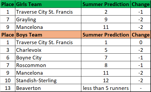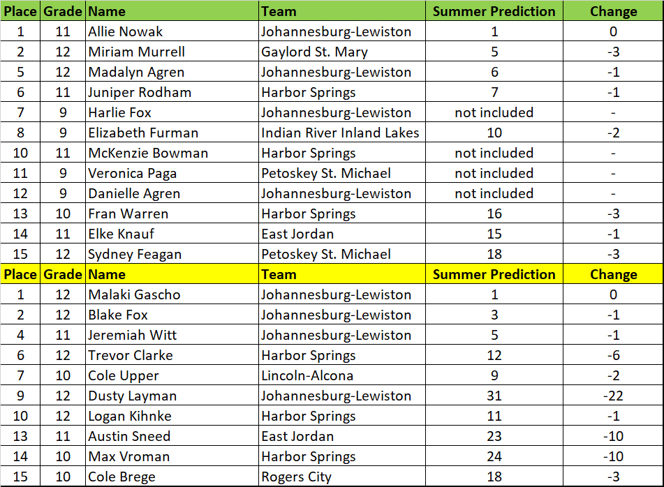 These might be much different than the athletic.net hypothetical meet. Anet uses the best performance from the season. I take more races into account, as I feel the entire resume speaks a greater volume about someone. Anet uses jamborees and duals, for which I don’t have time to calculate. Anet doesn’t account for course differences. If you take the 160 boys that ran at both Holly and Jackson, on average the Jackson times were 30 seconds faster. We have great coaches in this state that promote week-to-week improvement, but clearly there are differences in courses (and there are short/questionable ones too)! I’m not saying one is better than the other, just that I prefer my own and my bet is that they’ll be more accurate when we do this again next month.