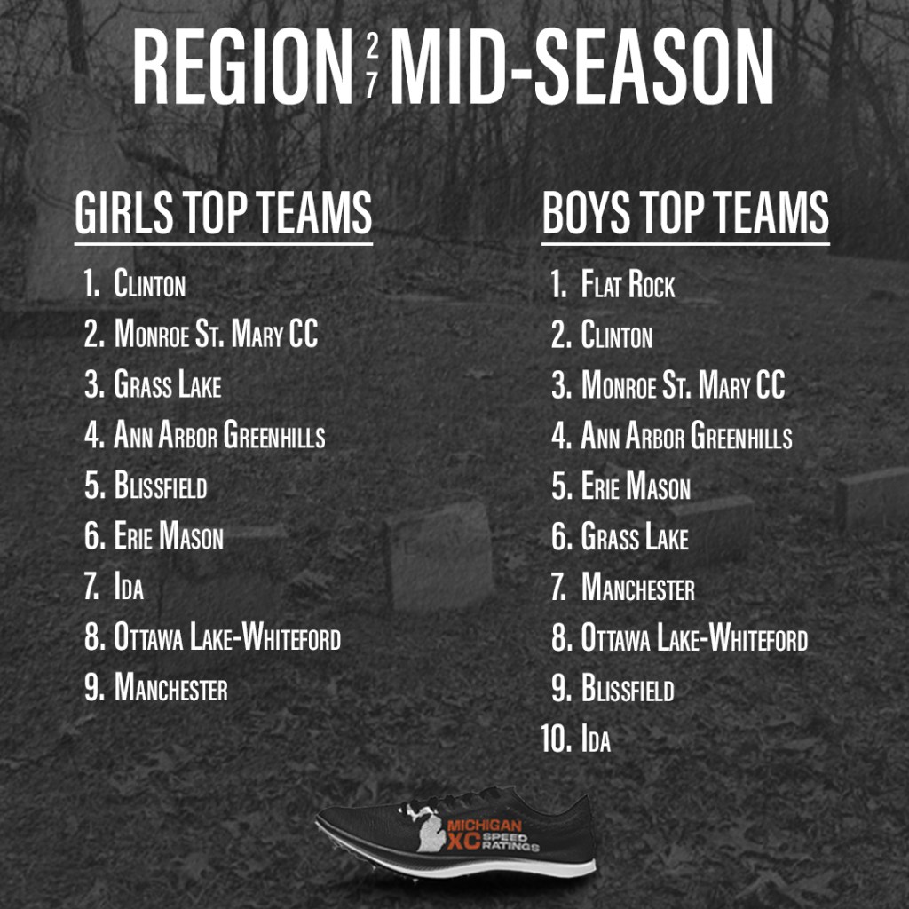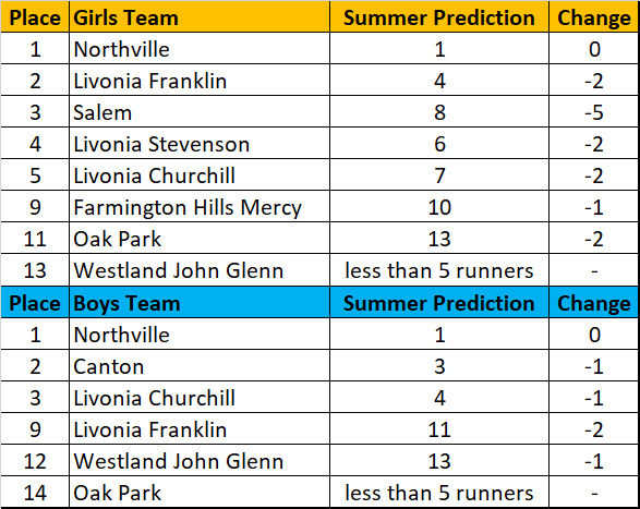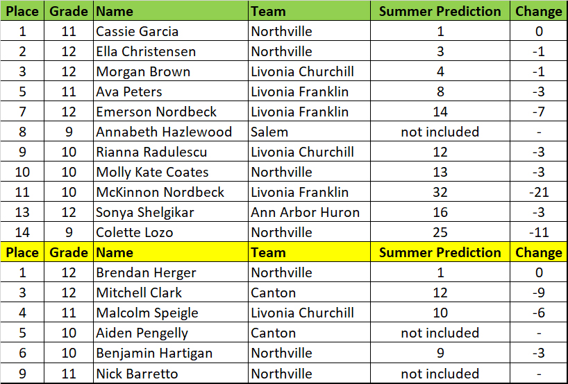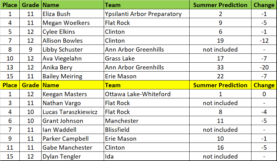These might be much different than the athletic.net hypothetical meet. Anet uses the best performance from the season. I take more races into account, as I feel the entire resume speaks a greater volume about someone. Anet uses jamborees and duals, for which I don’t have time to calculate. Anet doesn’t account for course differences. If you take the 160 boys that ran at both Holly and Jackson, on average the Jackson times were 30 seconds faster. We have great coaches in this state that promote week-to-week improvement, but clearly there are differences in courses (and there are short/questionable ones too)! I’m not saying one is better than the other, just that I prefer my own and my bet is that they’ll be more accurate when we do this again next month.