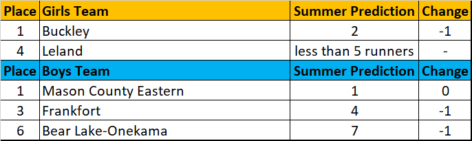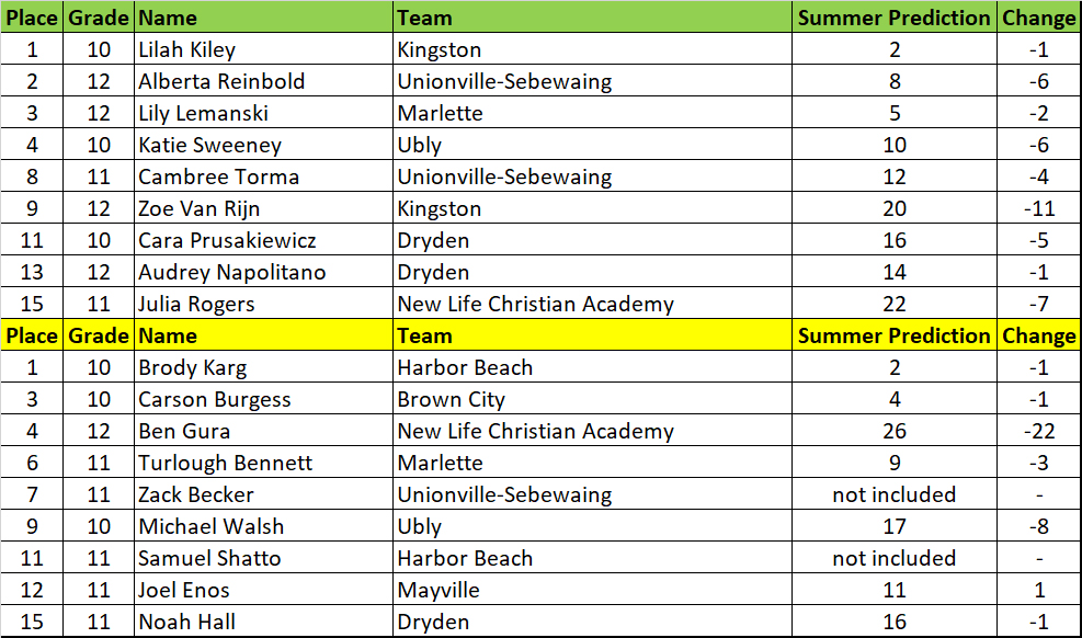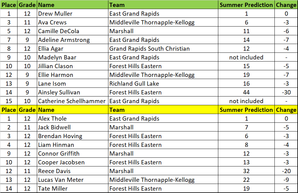 These might be much different than the athletic.net hypothetical meet. Anet uses the best performance from the season. I take more races into account, as I feel the entire resume speaks a greater volume about someone. Anet uses jamborees and duals, for which I don’t have time to calculate. Anet doesn’t account for course differences. If you take the 160 boys that ran at both Holly and Jackson, on average the Jackson times were 30 seconds faster. We have great coaches in this state that promote week-to-week improvement, but clearly there are differences in courses (and there are short/questionable ones too)! I’m not saying one is better than the other, just that I prefer my own and my bet is that they’ll be more accurate when we do this again next month.