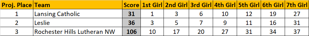 Leslie and Lansing Catholic appear to be neck and neck. Although the projections say one thing, results from this season say another. Just 10 days ago at Greater Lansing, the Blackhawks top-3 dominated the D3 crowd, competing with P-W for top honors among those teams. Though an advantage for LC might come in that their home course is filled with hills, as is the final mile at Possum Hollow.