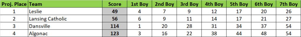 Just as the girls, Leslie and Lansing Catholic will likely duel for the team title, but we could have some intrigue for the 3rd qualifier. In late August, both Dansville and Algonac came over to the shores of Kent Lake for the Milford Invite. Dansville obtained a significant victory over the Muskrats. Since then, Algonac has had noticeable improvement from their freshmen and their frontrunner, but will it be enough?