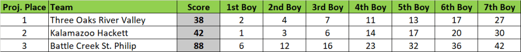 As with many of these Southwest schools, we can look to Portage and try to glean something from the River Valley vs. Hackett matchup. There, the Mustang pack laid a giant impact, in particular Adam Slavens through Braiden Brooks, placing six RV boys before Hackett’s fourth. In a smaller meet such as this, that significance gets toned down, so if kids such as Sehy and Siems can sneak up a spot or two, Hackett’s winning odds become larger.