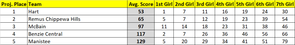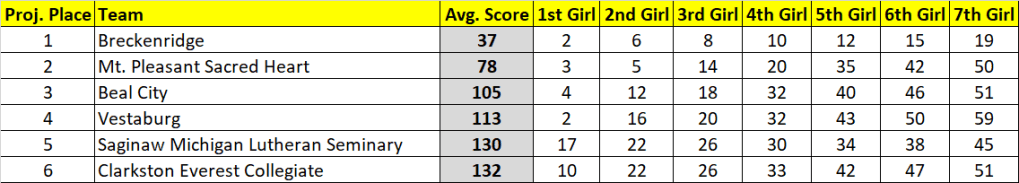 The simulations give the possibilities of those scenarios and all the various scoring scripts. A sixth girl that can pop off on any certain day, a reliable boy who always runs 17-flat, you name it. Hopefully, they better elucidate our contenders, qualifiers, and how these races play out over the weekend.
