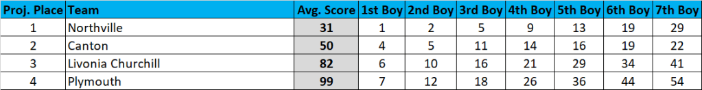 Just as last year and throughout the season, I’m projecting these using race simulations. Through a season’s worth of speed ratings, one can determine a runner’s average rating and the variability of those ratings. Both those factors are then weighed towards more recent meets, which are then simulated thousands of times using a Monte Carlo analysis (also described by TullyRunners here). Over those thousands of race simulations, one can determine a team’s average place and average score, a runner’s average place, odds on winning, and odds on qualifying.