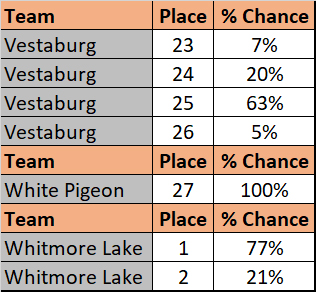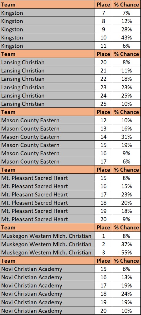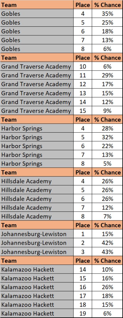 This year, just as the regionals were last week and projections were last year, I worked with the simulations. I liked my regional write-up for that, here’s one for example if you’d like to read. For the State version, I ran through 10x more simulations. Which really doesn’t sound like much, but when you graduate from 1,000 simulations to 10,000, that’s a significant jump. And given that the projected state qualifying teams were higher than ever, perhaps we’re onto something.