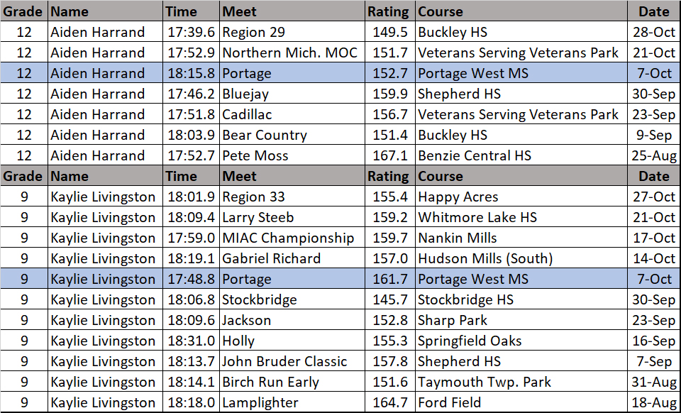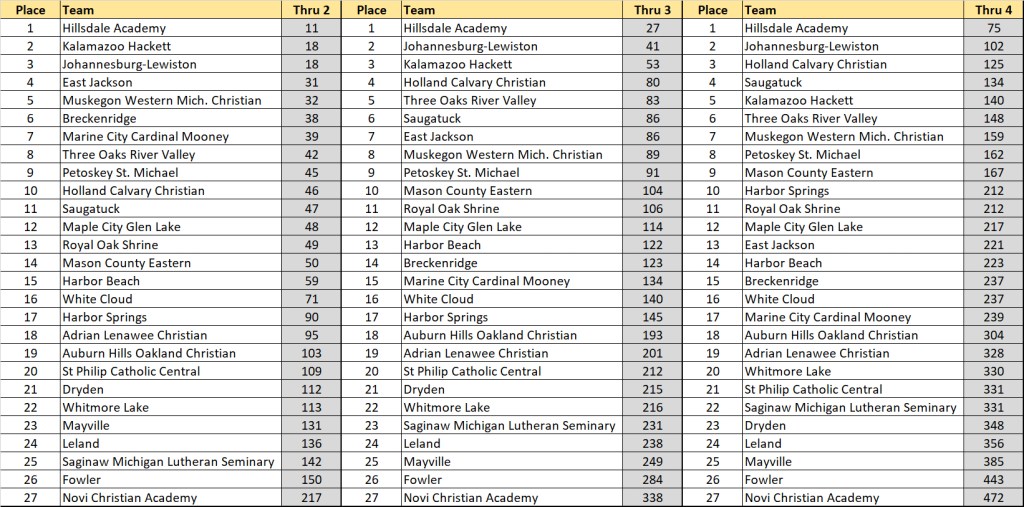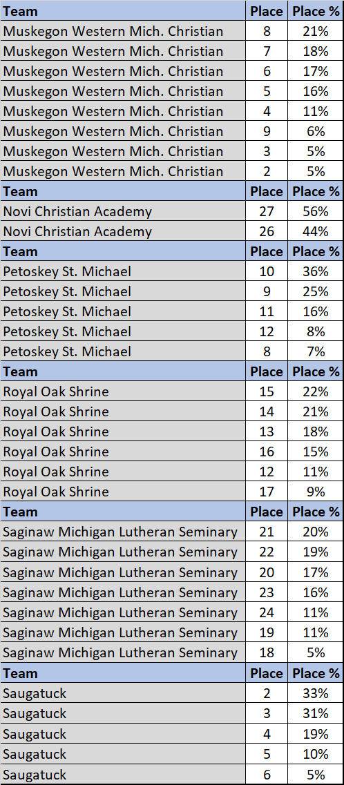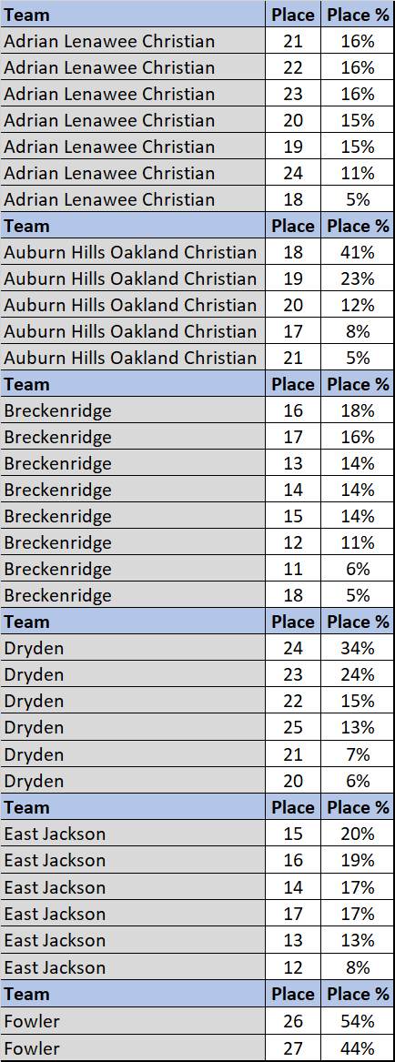 At Portage, teams such as J-L and WMC moved up throughout the race, as did Hillsdale Academy and Mt. Pleasant Sacred Heart. Perhaps the latter two are sleepers to run above their pay grade?