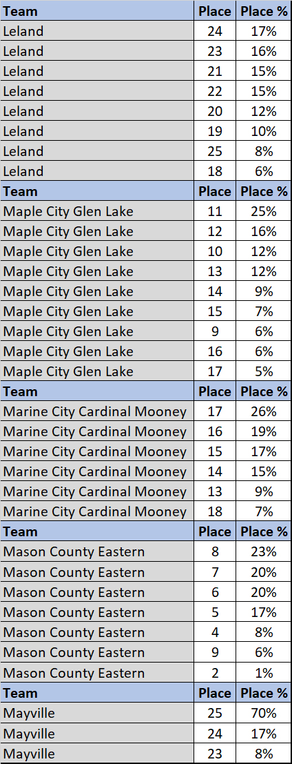 What I can glean from this data is that having the first fifth finisher is important, but not 100% necessary to win. If you have four elite runners such as Hart’s girls from 2019-2021 or Otsego’s girls last year, you can build up enough of a gap to overcome a pack finishing before your final scorer. If you don’t have those elite four, your 5th runner better be within 20 seconds of the fastest 5th in the field, or else you’re accumulating too many points in a hurry.