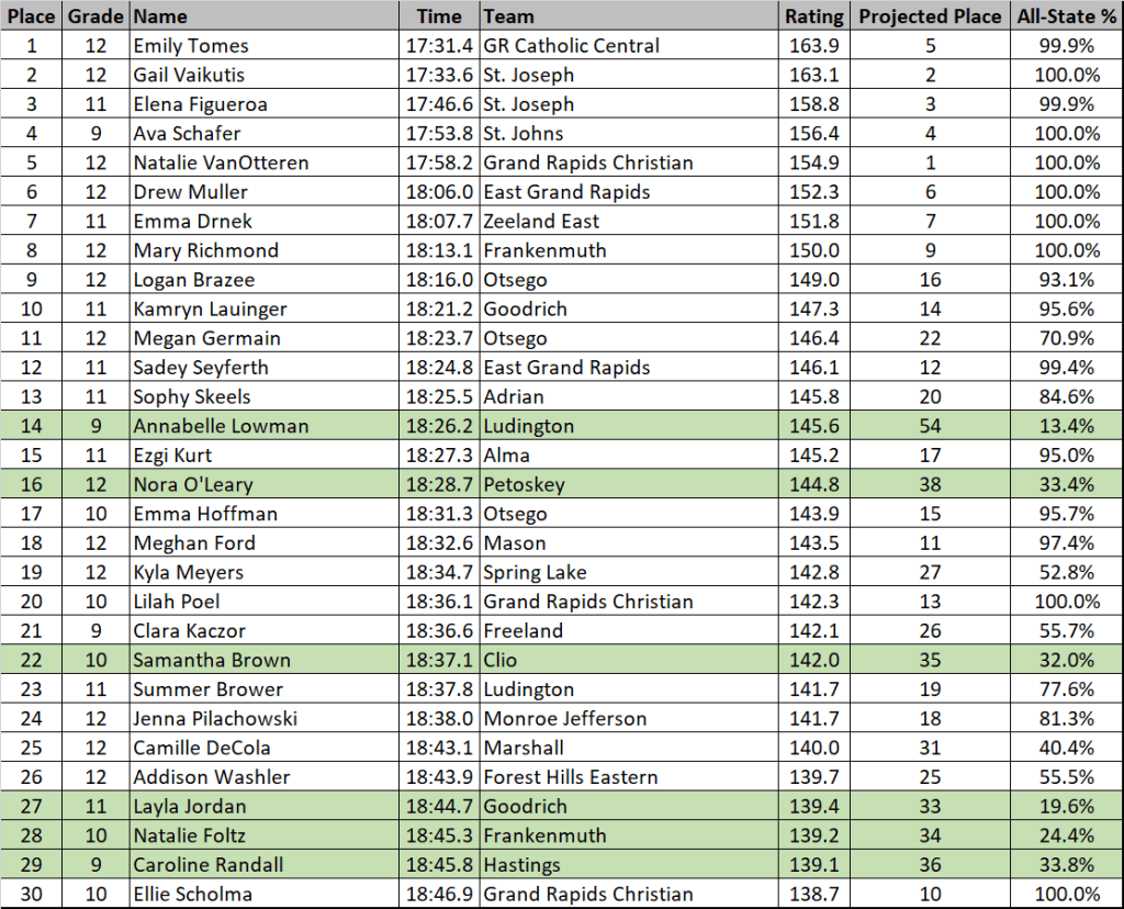 | 11 | Sadey Seyferth | 18:24.8 | East Grand Rapids | 146.1 |