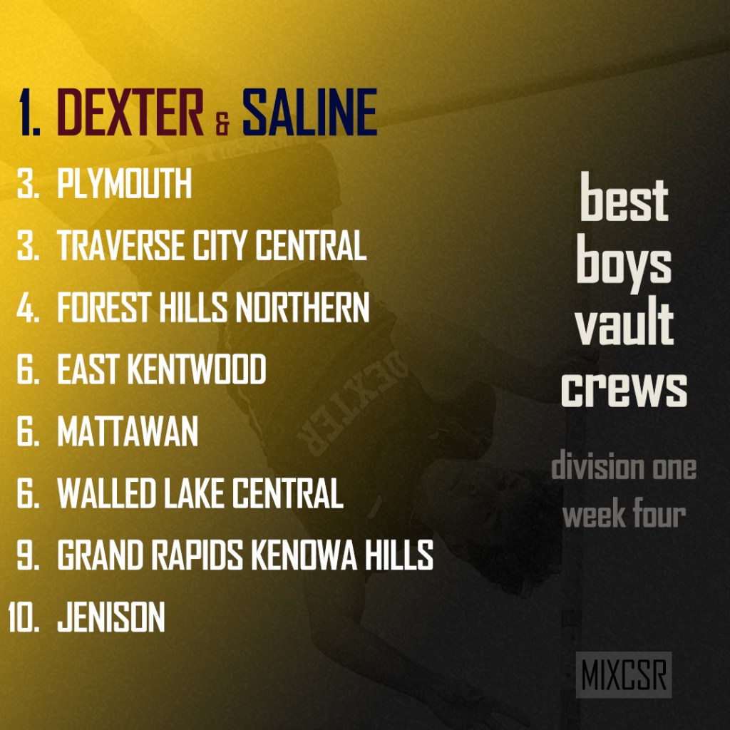 Grade Name Height Team Points 12 Clark Sheldon 14′ 6″ Dexter 460 12 Benjamin Sackman 14′ 0″ Dexter 443 Grade Name Height Team Points 12 Andrew Burns 14′ 6″ Saline 460 12 Malik Eisemann 14′ 0″ Saline 443 Grade Name Height Team Points 10 Sean Cinzori 13′ 6″ Plymouth 426 11 Maximus Petniunas 12′ 6″ Plymouth 392 Grade Name Height Team Points 11 Asher Paul 13′ 6″ Traverse City Central 426 11 Jace Rowell 12′ 6″ Traverse City Central 392