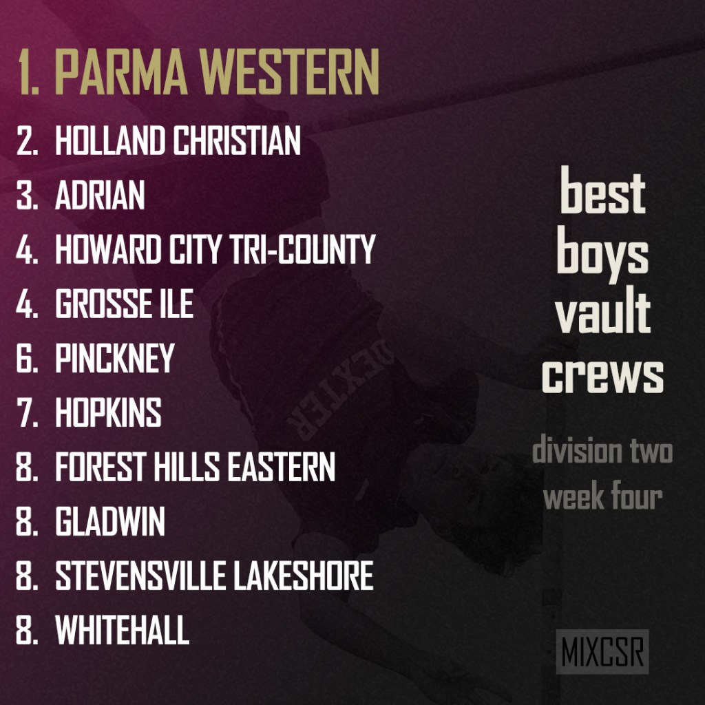 Grade Name Height Team Points 12 Lucas Inosencio 14′ 0″ Parma Western 443 10 Braden Vancalbergh 13′ 0″ Parma Western 409 Grade Name Height Team Points 12 Nathan Bengelink 12′ 6″ Holland Christian 392 10 Will Johnson 11′ 6″ Holland Christian 359 Grade Name Height Team Points 11 William Winckles 12′ 0″ Adrian 375 11 Aaron Miller 11′ 6″ Adrian 359