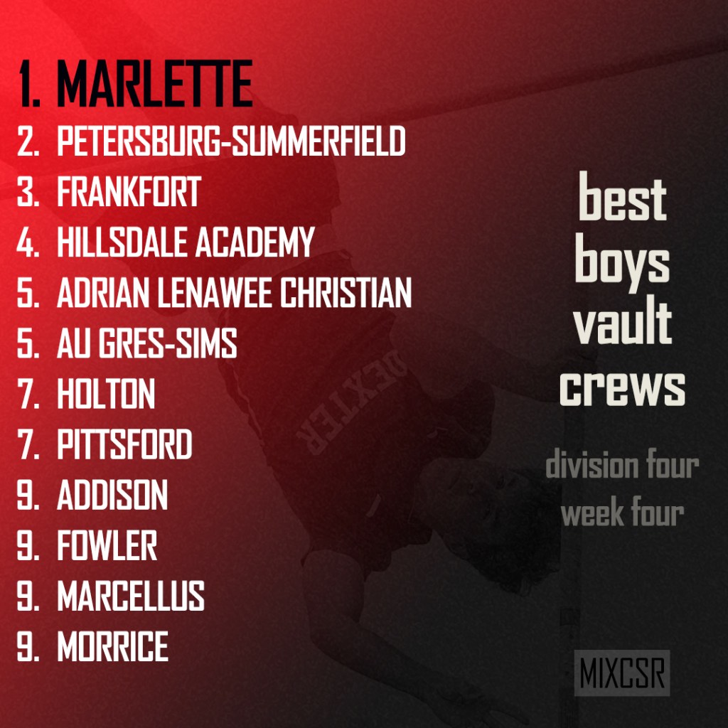 Grade Name Height Team Points 12 Logan Malloy 13′ 6″ Marlette 426 12 Tyler Izydorek 12′ 0″ Marlette 375 10 Logan McIntyre 9′ 6″ Marlette 291 Grade Name Height Team Points 9 Austin Taylor 10′ 0″ Petersburg-Summerfield 308 11 Jackson Iott 9′ 6″ Petersburg-Summerfield 291 9 Benjamin Gault 9′ 6″ Petersburg-Summerfield 291 Grade Name Height Team Points 12 Adam Townsend 11′ 6″ Frankfort 359 10 Colton Bates 9′ 6″ Frankfort 291