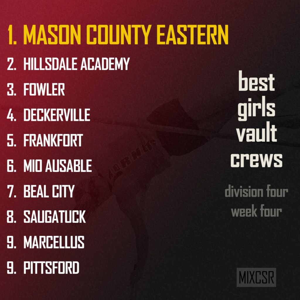 Grade Name Height Team Points 11 Madison Cooke 9′ 6″ Pinckney 380 11 Nadia Jacobs 9′ 6″ Pinckney 380 12 Brianna Wheaton 9′ 0″ Pinckney 360 Grade Name Height Team Points 11 Kennedy Jasinski 10′ 6″ Wayland Union 420 10 Evie Mathis 9′ 6″ Wayland Union 380 Grade Name Height Team Points 12 Kendal Waligorski 10′ 0″ Ludington 400 11 Catherine Karboske 9′ 0″ Ludington 360