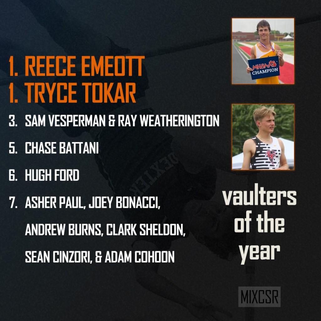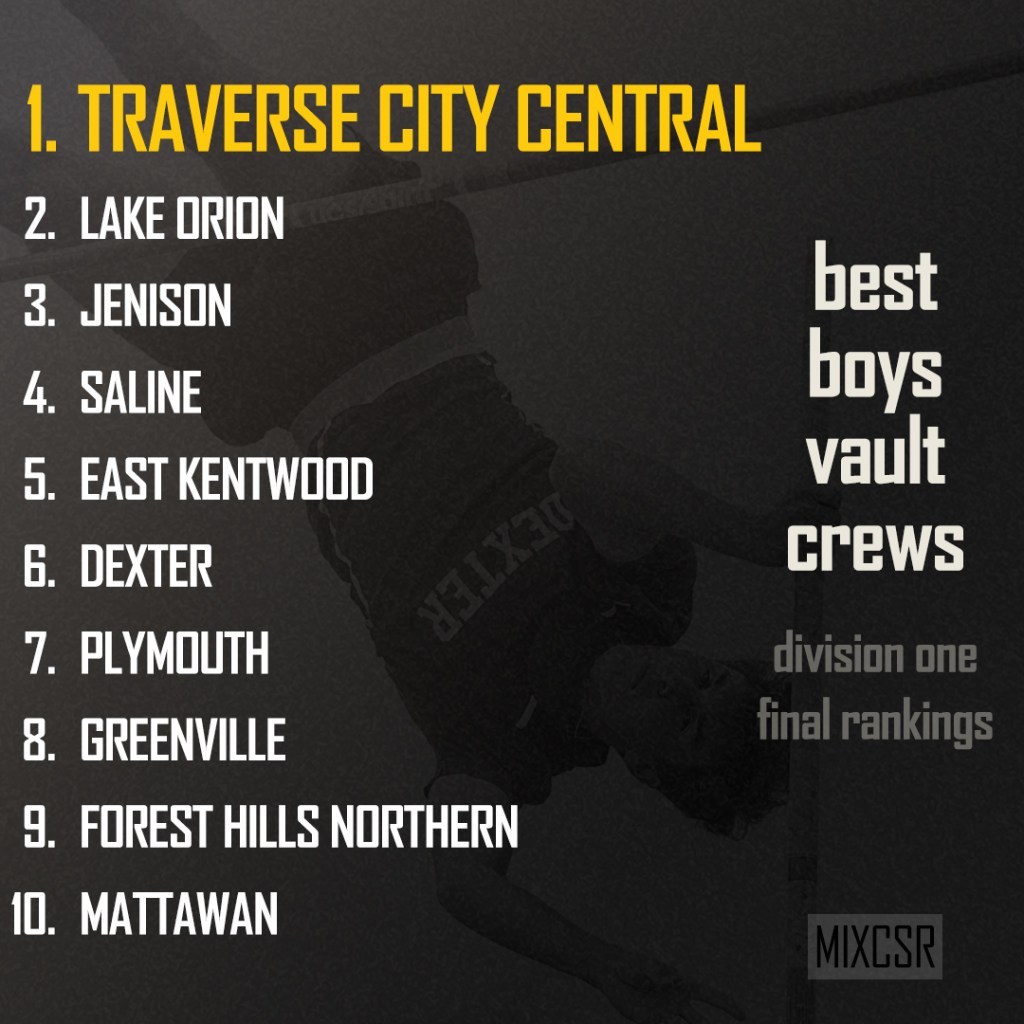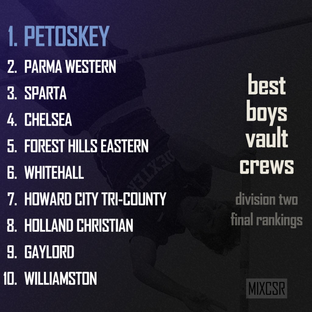 No crazy math here. The Pole Vault combines many events into one – strength, speed, and lifting off. Then add a healthy dose of fearlessness and you’ve got a vaulter. The list below mimics what you’d see on athletic.net or Michtrack’s official state list .