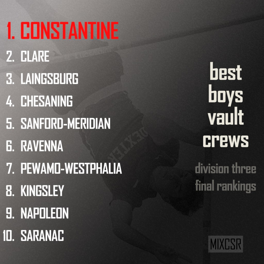 Grade Name Team Height Points 11 Brody Jones Constantine 13′ 6″ 426 10 Bear Geibe Constantine 12′ 0″ 375 12 Michael Featherstone Constantine 12′ 0″ 375 9 Aaron Hochstetler Constantine 11′ 0″ 342