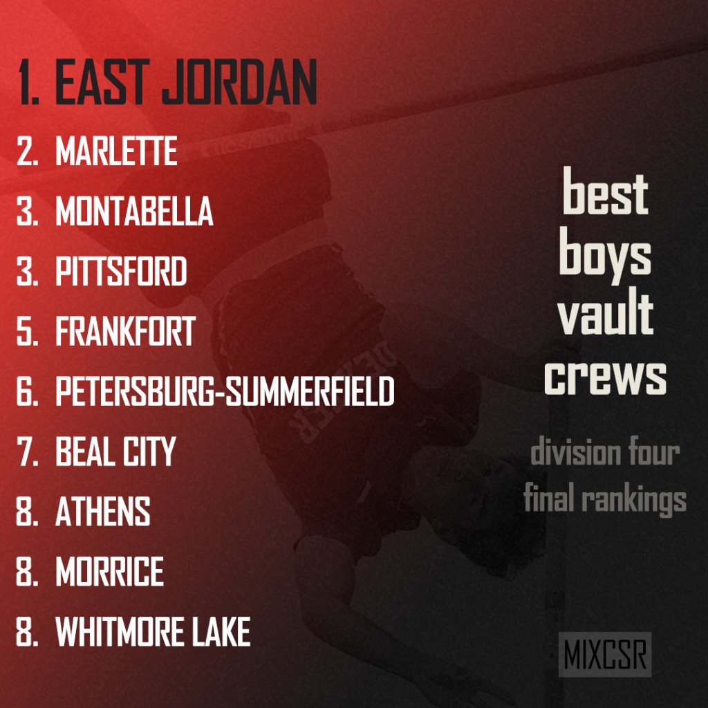Grade Name Team Height Points 9 Jordan Fajardo East Jordan 11′ 0″ 342 9 Bryan Peck East Jordan 10′ 0″ 308 12 Daniel Ziebarth East Jordan 9′ 6″ 291 11 Kamden Bartlett East Jordan 9′ 6″ 291