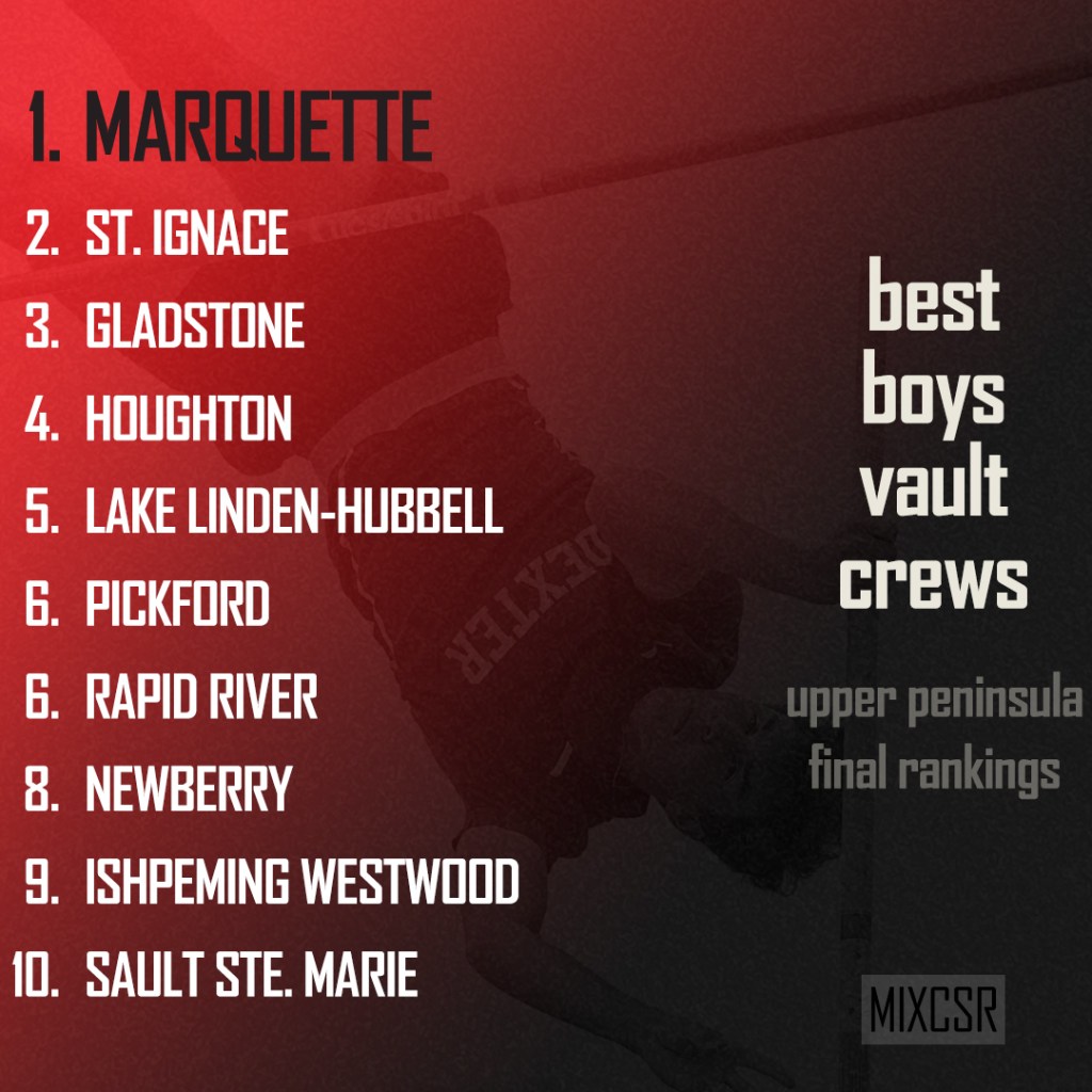Grade Name Team Height Points 11 Drew Bradley Marquette 13′ 6″ 494 11 Micheal Cattoor Marquette 13′ 6″ 409 12 Andrew Brunswick Marquette 9′ 6″ 437