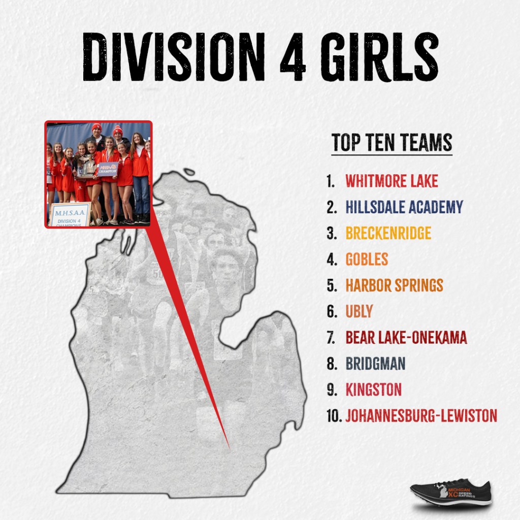 At last year’s WMD Championship, only two squads had full scoring outfits: Pentwater and Mason County Eastern. MCE is ranked #16 in D4, although we’ll see how the Manistee Catholic closing situation affects their roster. Region 29 is STACKED, with 5 teams in the top-17. The Lakers are clearly the favorites and will have the added insurance of hopefully putting four girls in the top-20. I’d expect a win, but you never know with that competition.