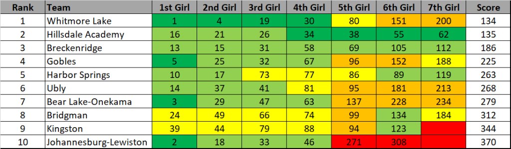 Their low stick and top four. Libby Smith was 7th in the division last fall and she’s coming off a track season where she ran 11:15 in the 32. She can only lose 6 possible points, but it’s one spot the Tigers need not worry about. Ava DeYoung was Gobles’ 4th girl at State, all year she was a low-20 girl. Unfortunately, MIS was the outlier, she has all the potential to be mixing it up for a podium spot.