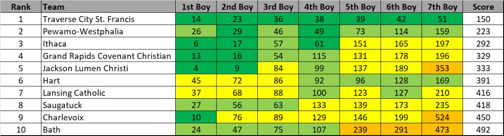 With the LMC dissolving, it appears St. Francis is without a home. Shouldn’t have too much effect on their scheduling, as that conference only had one race. Thankfully, the Northern Michigan MoC is still a concept. Currently, I have TCSF as the 2nd best team in Up North, Traverse City Central slightly ahead. TCC isn’t attending the MoC, so the Glads are the favorite once again. Region 19 looks to be a certain qualifier, leaving all eyes on State.