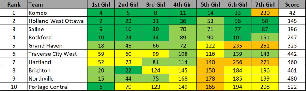 It’s tough when comparing to Romeo. A strength compared to other teams in the division appears as a weakness when looking to the Bulldogs. A tiny area where the Panthers could move up is finding a girl to rein in the gap between Helen Sachs and the rest of their pack. Ava Porras had some off races last year, but when she was on, she was able to run in the low-18’s.