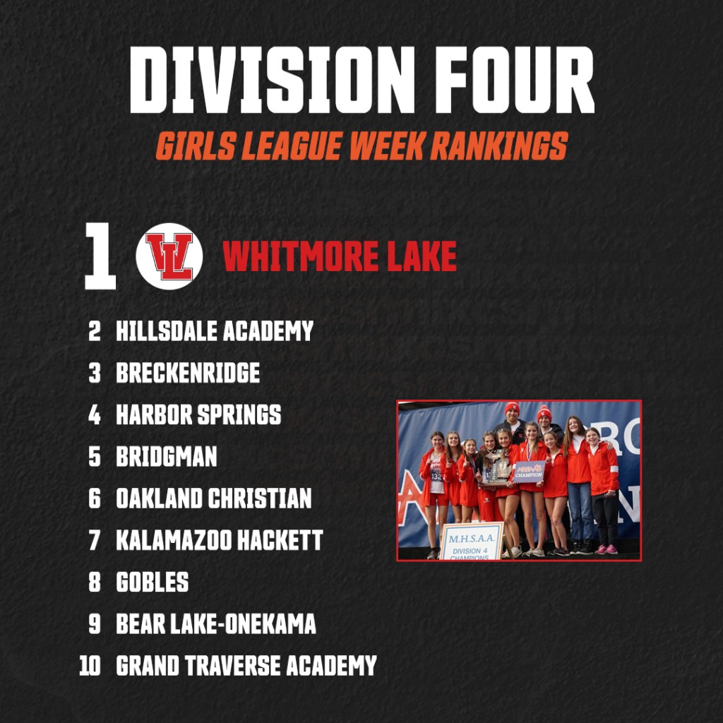Rank Team Score Region Top 5 Avg. Last Week 1 Whitmore Lake 164 33 110.1 1 2 Hillsdale Academy 201 34 95.6 2 3 Breckenridge 217 30 93.4 3 4 Harbor Springs 220 28 93.6 5 5 Bridgman 221 32 92.4 4 6 Auburn Hills Oakland Christian 286 36 91.1 7 7 Kalamazoo Hackett 288 32 87.0 6 8 Gobles 301 31 92.4 8 9 Bear Lake-Onekama 352 29 86.7 9 10 Grand Traverse Academy 412 29 74.8 10 11 Ubly 418 35 72.8 12 12 Royal Oak Shrine 421 36 72.5 11 13 Fowler 460 31 71.9 25 14 Lansing Christian 463 33 71.2 15 15 Buckley 479 29 67.8 13 16 Clarkston Everest Collegiate 508 33 66.1 23 17 Vestaburg 528 30 70.7 14 18 Unionville-Sebewaing 554 35 63.1 16 19 Martin 562 31 64.4 18 20 Maple City Glen Lake 578 29 60.0 19 21 Harbor Beach 622 35 57.0 20 22 Holland Calvary Christian 676 31 50.2 17 23 Leland 685 29 41.8 22 24 Plymouth Christian Academy 688 36 53.6 27 25 Dryden 714 35 49.2 24 26 Mason County Eastern 719 29 47.1 28 27 Beal City 721 30 46.5 21
