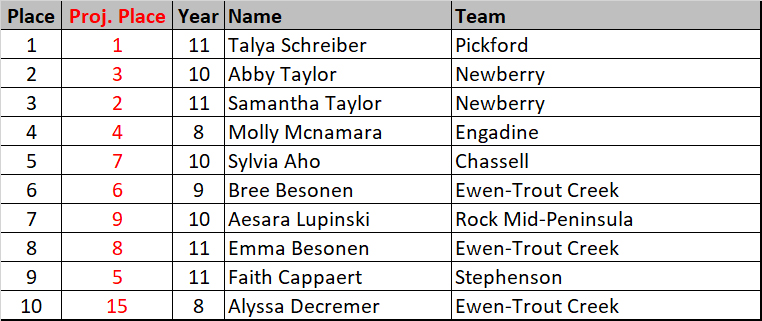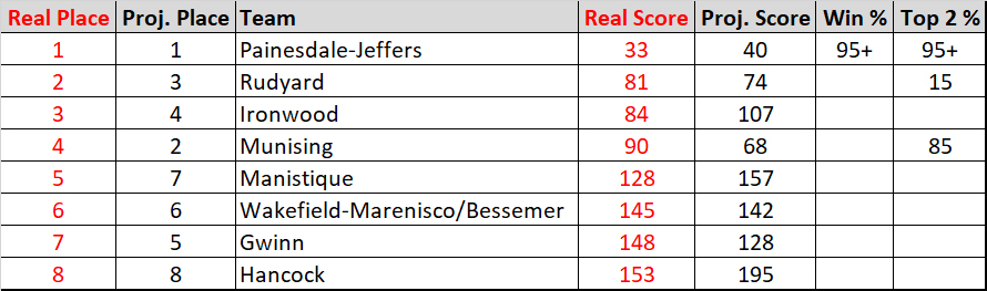 Unfortunately, Munising was missing a few boys from earlier in the season, which left an opportunity for another team to grab second place. Rudyard was projected third with an outside shot at the top-two. The Bulldogs seized the opportunity, with Camron Willis providing a huge boost, placing 10 spots ahead of his projection.