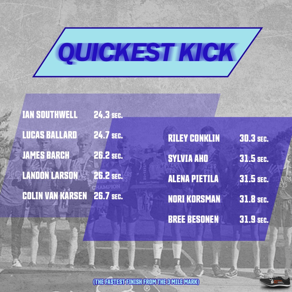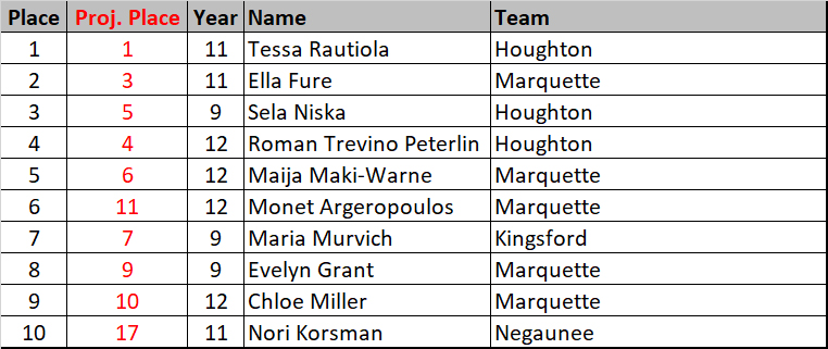 Two additions to the top-10 that the projections didn’t see coming – Joey Lauzon and Tage Rajala. The projections should’ve looked to the past, where evidence had shown that Lauzon brought his best stuff on State day, October’s race was his fourth consecutive top-10 spot. Added insurance for Painesdale-Jeffers came in the form of Rajala, who unleashed a nearly 30 sec. personal best.
