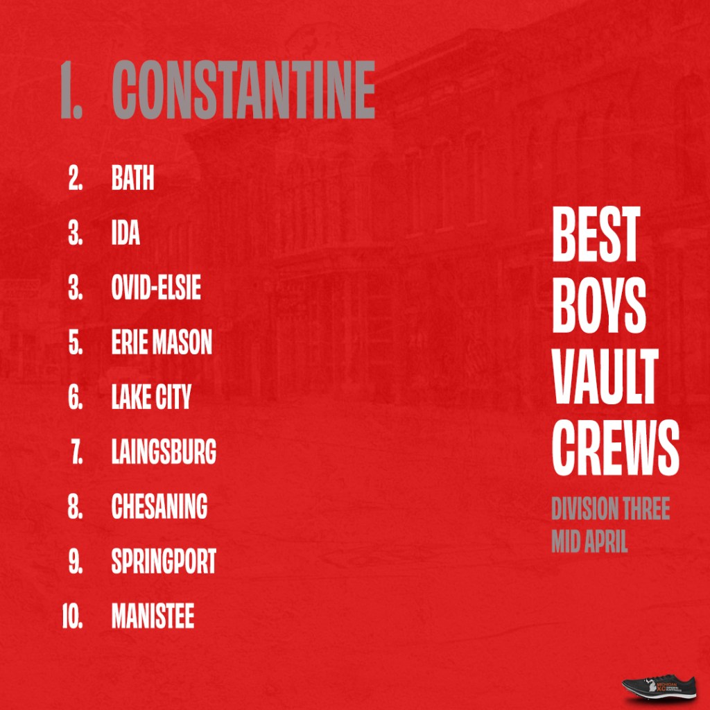 Grade Name Mark Team Points 12 Brody Jones 13′ 6″ Constantine 426 10 Aaron Hochstetler 12′ 6″ Constantine 392 11 Bear Geibe 11′ 0″ Constantine 342