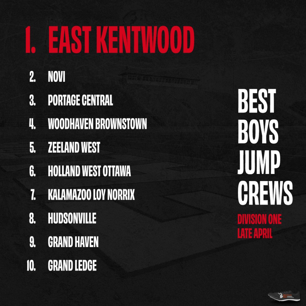 Rank Team High Jump Long Jump Total 1 Rockford 1319 1153 2472 2 East Kentwood 687 1109 1796 3 Zeeland East 1050 745 1795 4 Grand Haven 725 1065 1791 5 Salem 649 1060 1709 6 Livonia Churchill 649 1057 1705 7 Middleville Thornapple-Kellogg 649 999 1648 8 Byron Center 401 1111 1512 9 Brighton 725 707 1432 10 Macomb Dakota 725 704 1430 11 Ann Arbor Pioneer 1069 345 1414 12 Okemos 324 1088 1412 13 Saline 649 708 1356 14 Rochester 401 744 1146 15 Traverse City West 440 660 1100 16 Grand Ledge 725 368 1093 17 Clarkston 725 365 1091 18 Greenville 764 324 1088 19 Novi – 1084 1084 20 Northville – 1046 1046 21 Howell 687 341 1028 22 Troy 687 321 1008 23 Rochester Adams 324 666 990 24 Zeeland West – 987 987 25 Jenison 324 658 982