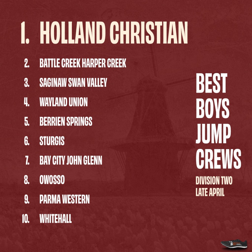 Grade Name Mark Team Points Event 12 Joe Strabbing 6′ 4″ Holland Christian 434 High Jump 11 Jayden Rees 6′ 0″ Holland Christian 377 High Jump 12 Josh Bruxvoort 20′ 5.25″ Holland Christian 356 Long Jump 11 Isaac DeMaster 5′ 10″ Holland Christian 349 High Jump 11 Isaiah Myaard 20′ 2.5″ Holland Christian 346 Long Jump