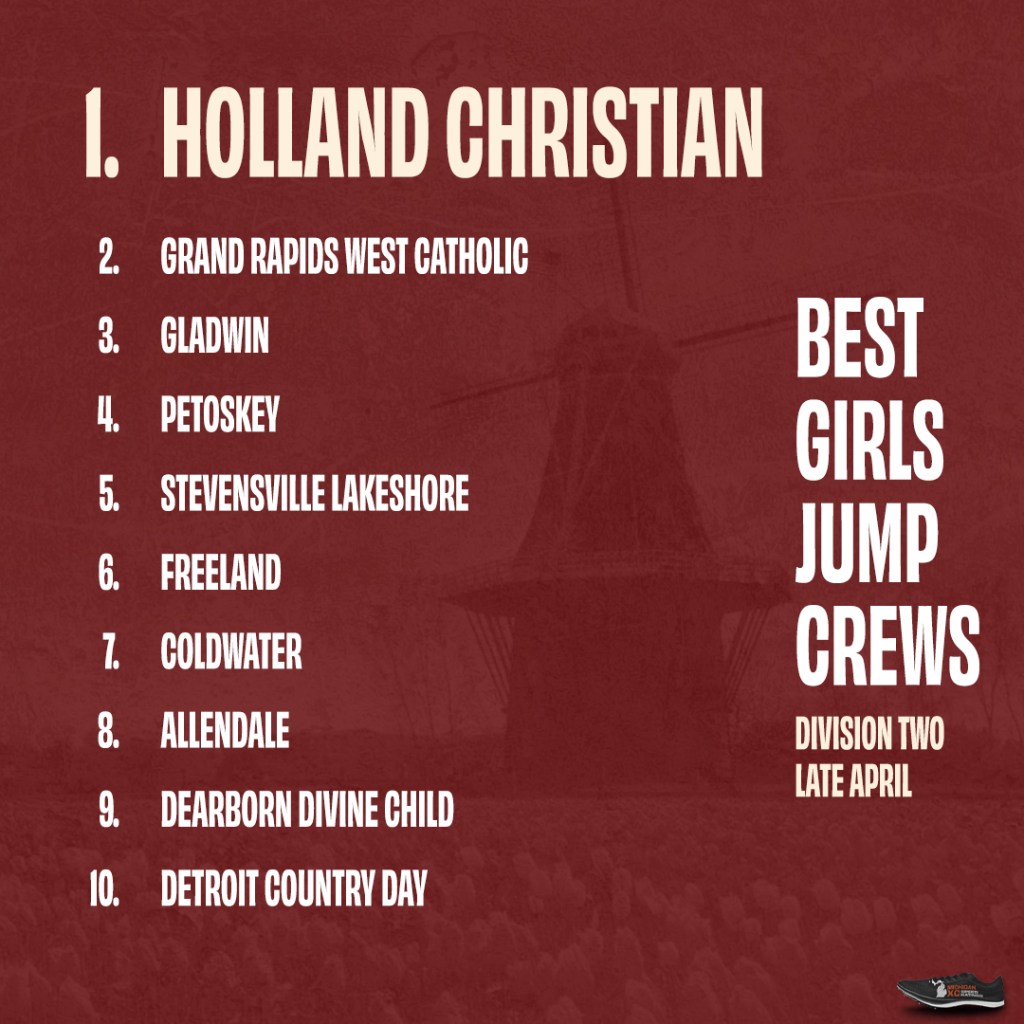 Rank Team High Jump Long Jump Total 1 Holland Christian 1050 791 1841 2 Grand Rapids West Catholic 973 627 1600 3 Gladwin 1069 373 1442 4 Petoskey 687 713 1400 5 Stevensville Lakeshore 572 757 1329 6 Freeland 610 708 1318 7 Coldwater 857 397 1255 8 Allendale 857 317 1175 9 Dearborn Divine Child 706 443 1149 10 Detroit Country Day 706 370 1076 11 Charlotte 1031 – 1031 12 Shepherd 649 366 1015 13 Hudsonville Unity Christian 649 342 990 14 Frankenmuth 610 335 945 15 East Grand Rapids 610 315 925 16 Yale 440 446 886 17 Hastings 478 406 884 18 Benton Harbor – 796 796 19 Edwardsburg 478 317 795 20 Ferndale – 760 760 21 St. Clair Shores Lake Shore 401 356 757 22 Lake Fenton 745 – 745 23 Eaton Rapids 363 357 720 24 Battle Creek Harper Creek 401 310 712 25 St. Johns 363 346 709