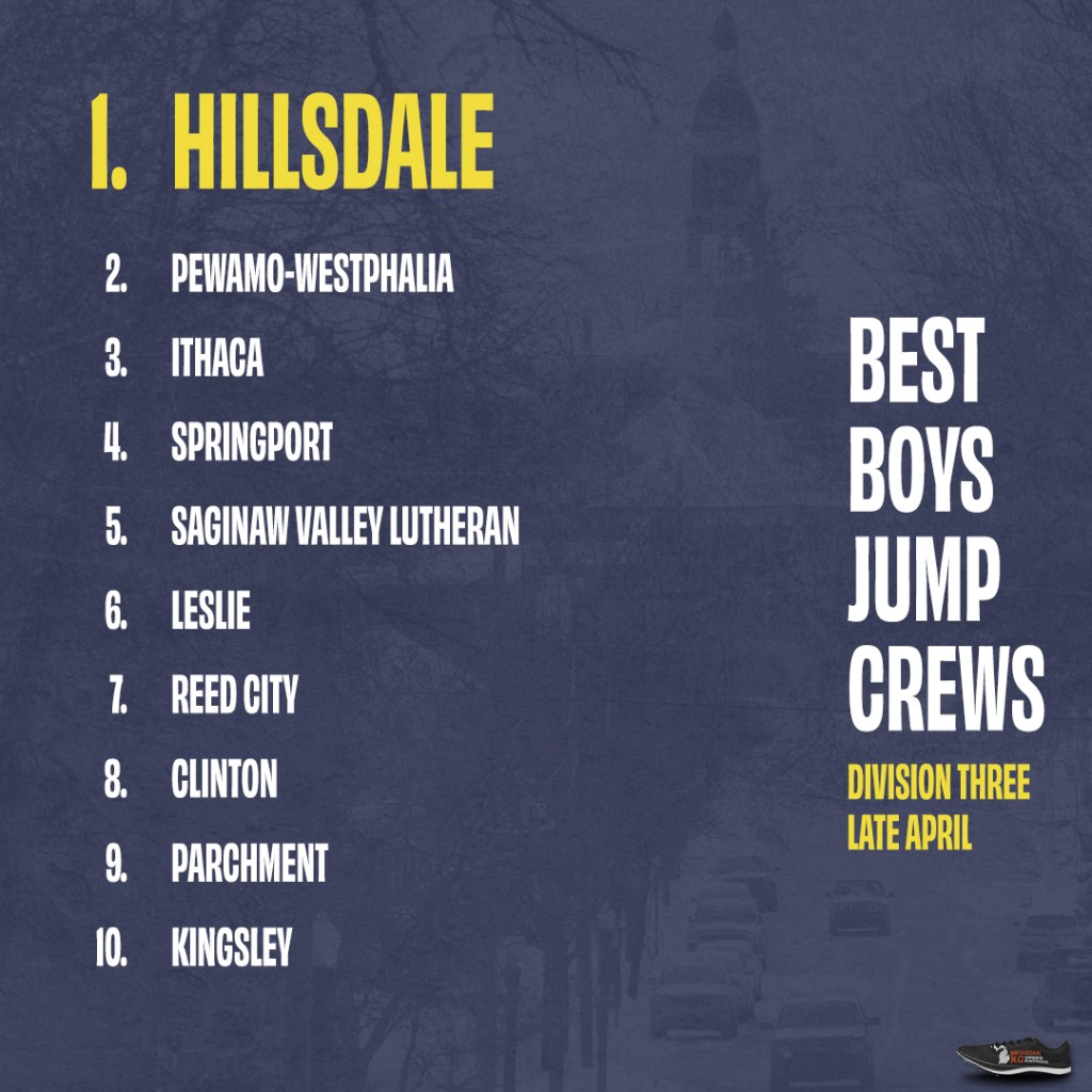 Rank Team High Jump Long Jump Total 1 Hillsdale 1103 670 1773 2 Pewamo-Westphalia 991 726 1716 3 Ithaca 1019 609 1628 4 Springport 642 921 1563 5 Saginaw Valley Lutheran 1075 384 1459 6 Leslie 740 664 1405 7 Reed City 349 1029 1378 8 Clinton 1047 330 1377 9 Parchment 670 653 1323 10 Kingsley 783 385 1168 11 Warren Michigan Collegiate 783 330 1113 12 Niles Brandywine 726 380 1106 13 McBain 1089 – 1089 14 Adrian Madison 349 721 1070 15 Chesaning 740 323 1064 16 Jackson Lumen Christi 1047 – 1047 17 Jonesville 321 691 1012 18 Standish Sterling 349 663 1012 19 Mason County Central 712 293 1005 20 Sanford-Meridian 335 641 976 21 Manton 670 295 965 22 Hanover-Horton 349 609 958 23 Grass Lake 948 – 948 24 Lake City 293 647 939 25 Manistee 293 634 927